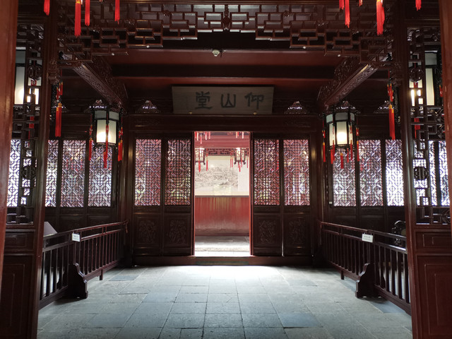 仰山堂。五楹结构,北部回廊临池而建,游人可穿堂而过。