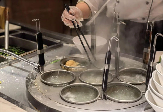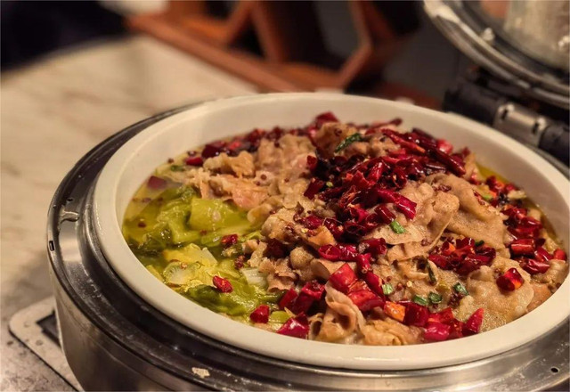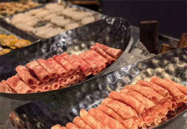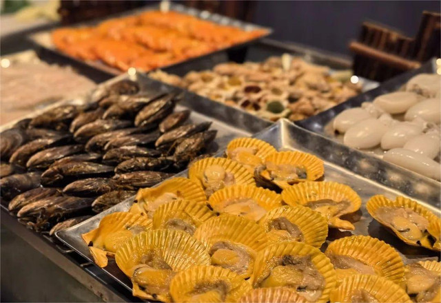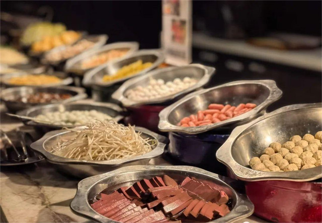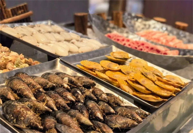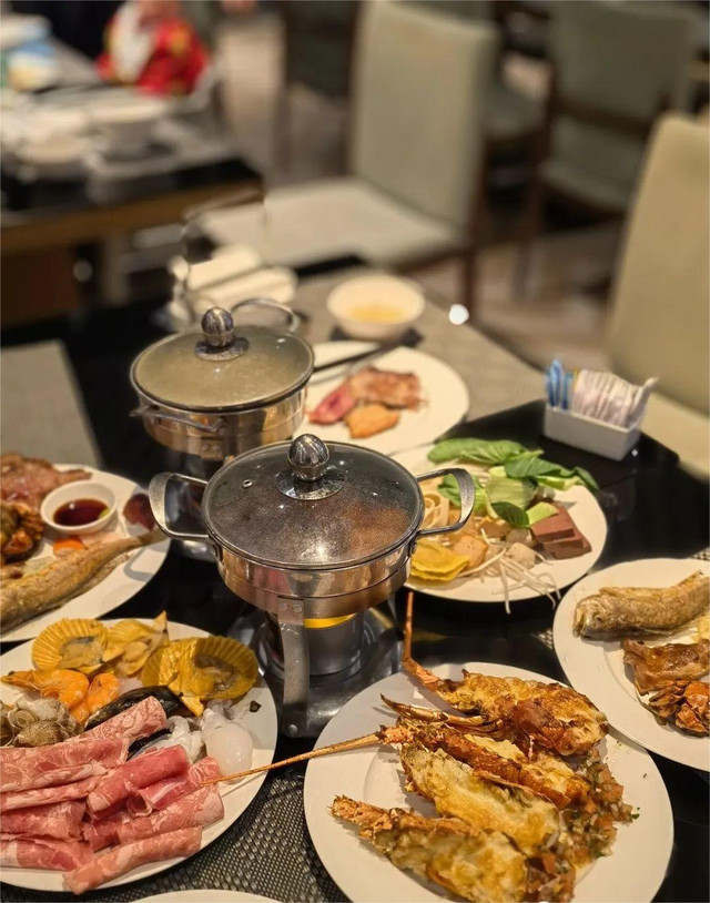 看看,海鲜小火锅的配菜怎么样?各种贝类鱼虾海螺鱿鱼、牛羊肉、鱼丸肉丸蔬菜……(注:春节期间暂不供应小火锅)