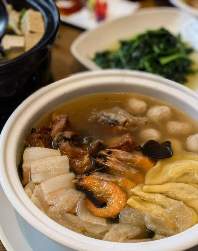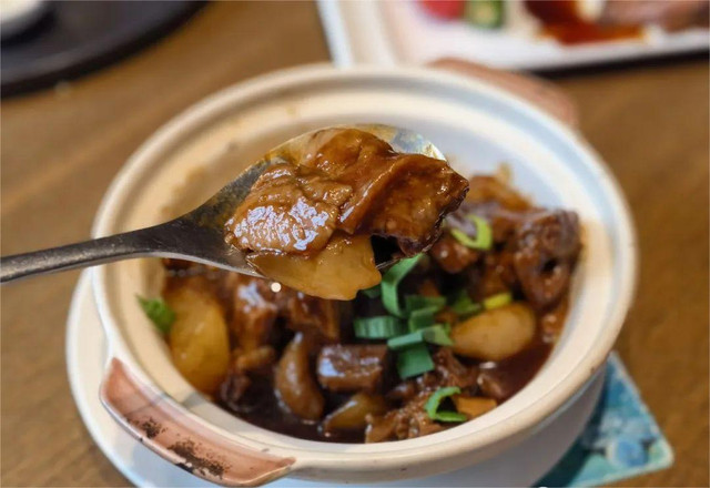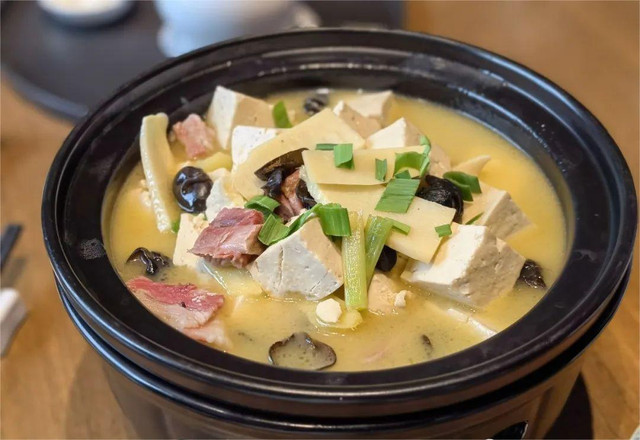 菜品更嗲,我连吃了两天依旧怀念。果然,青浦的菜也比市区的好吃啊!柱候酱牛筋腩煲,白萝卜里早已吸饱了肉汁,一口下去极其浓郁。浓汤煮台州豆腐,豆腐里也是吸得满满的火腿汤汁,鲜香异常。