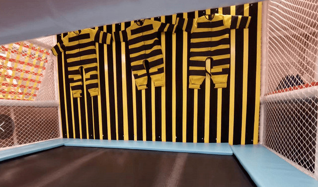 还有两个好玩的,蹦床粘粘乐,套上衣服,往墙上一贴,人就粘上去啦!我怕屁孩太重直接摔个狗吃屎,没让他试,啊哈哈哈。
