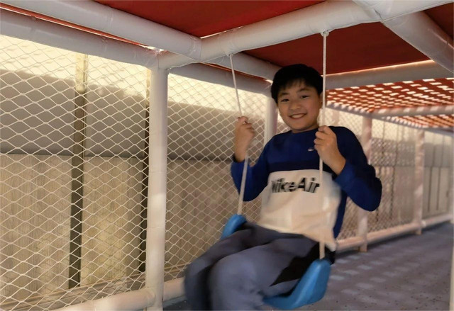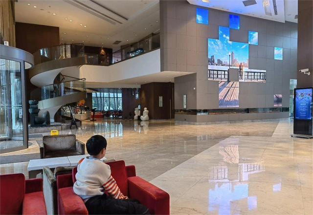 大堂巧心思地设计了各种切面式的屏幕,屁孩傻傻地坐着看,简直把它当成超级大电视。