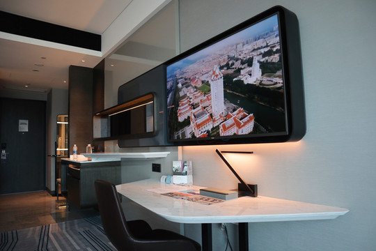 现今科技与通讯的发展使得⼯作与⽣活的交织愈加紧密,商旅⼈⼠愈加希望在差旅中兼顾两者。告别传统的紫红配色,全新的“WorkLife ”客房,以极具突破的新现代风格将引领酒店客房新风尚,成就⾼效商旅,升级⼊住体验,将⾼效性发挥⾄极,完美的功能分区合理利⽤每⼀⼨空间,⽆论何时何地都能随时随地办公或放松身心。酒店303间客房及套房贴合现代商旅客人需求,灵活分隔工作区与休闲区。高低工作台满足站立及坐式双核办公,多功能沙发区采用半包围式沙发,工作、休闲、会议随心切换,随时随地快速高效地投入工作或享受惬意的休闲时光。