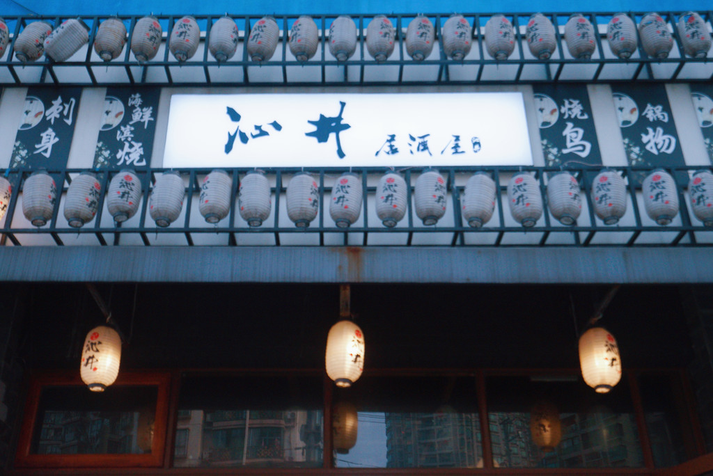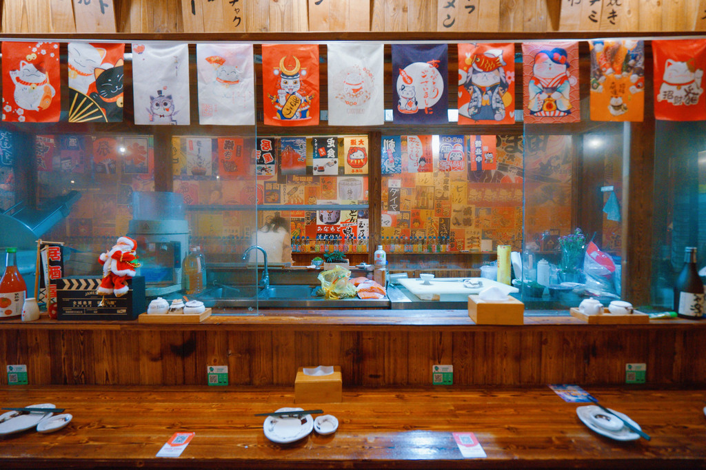 低调的门脸,长长的黑底加有些规矩的白色字体,字大不张扬,但又一目了然。居酒屋中央全日式吧台,能让食客们看到整个做菜过程。店内光线昏黄,四周墙上贴了很多日式画,搭配屋顶吊着晕黄色的灯,极简的装修风格,很有日式居酒屋气氛。