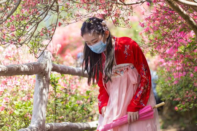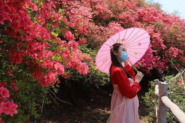 今年因为疫情的原因,景区赏花的人并不多,为了安全,也为了留下纪念,我们特地戴上口罩与杜鹃花海同框出镜,记录下这个特殊的春天。