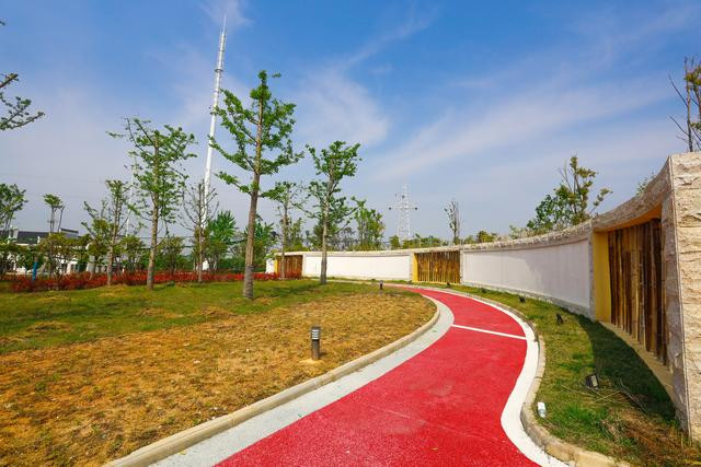 公园里,绿树林立,柳树依依,色彩鲜艳的跑道和健身器材点缀其中,点燃了村民们全民健身的热情,呈现出一派欣欣向荣的乡村新景象。
