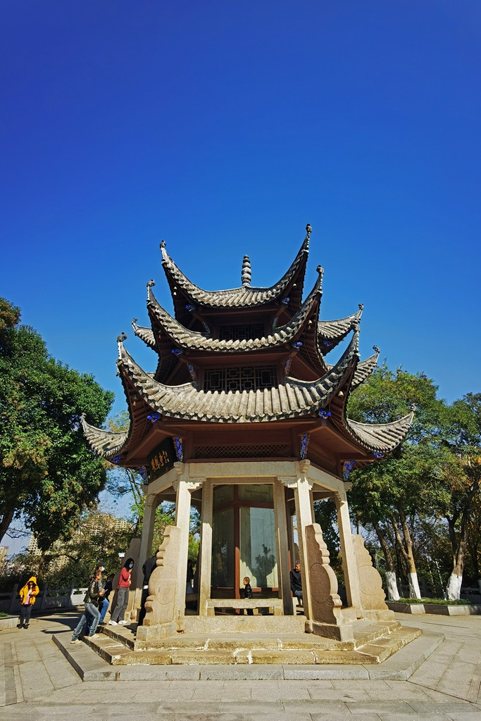 双凤公园离二程书院不远,穿过一段山路,双凤亭在望。所谓“双凤”,取“二程之母夜梦双凤投怀”意,也即程颢程颐。双凤亭始建北宋末年,原在黄陂县城里,几经变迁,清朝时移建于双凤亭于鲁台山巅。现存古亭为道光年间重建,六角三重,攒尖宝顶,飞檐翘角,四面悬郭沫若题“双凤亭”匾额。亭里有块清代石碑,四面雕刻建亭时的官府文告。