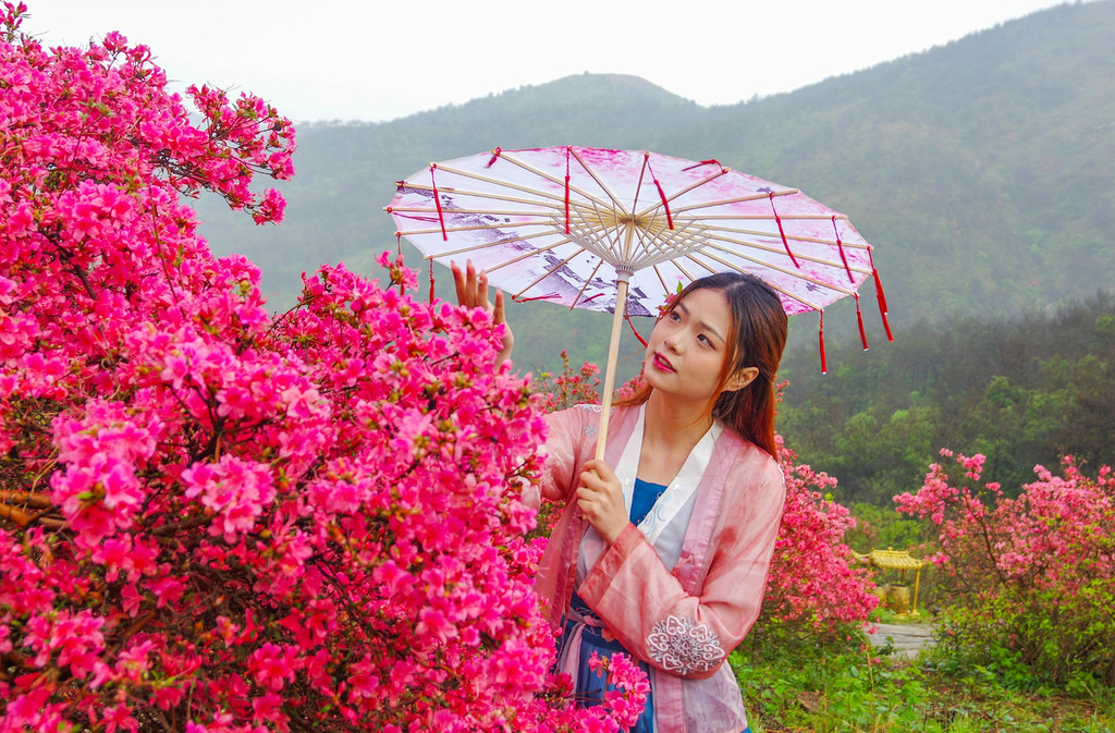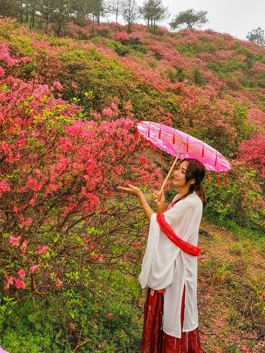 搭乘摆渡车一路风驰电掣,大约二十多分钟就抵达了观赏杜鹃花的入口。虽然下着淅淅沥沥的小雨,偶尔一阵山风拂过脸颊,真有点微冷。但是漫山遍野的杜鹃花花开正艳,一株株花团锦簇,像亭亭玉立的仙女似的,显得格外美丽。