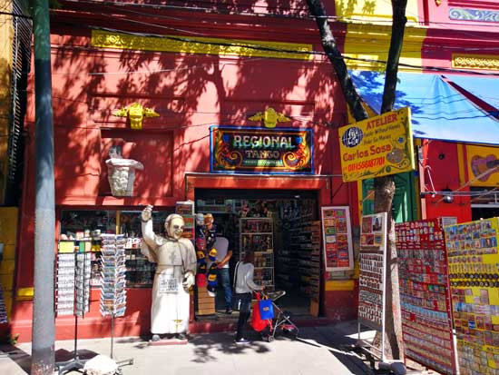 漫步在五彩斑斓的博卡老街区,只见各种出售旅游纪念品的商店、酒馆和咖啡馆鳞次栉比。其中以探戈为主题的绘画、雕塑、服饰、钥匙链琳琅满目,应有尽有,不过最受欢迎的商品还应该算是阿根廷国家队的足球服。