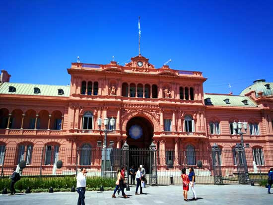 漫游五月广场,只见四周有绿茸平整的草坪、四季怒放的花卉、清澈晶莹的喷泉和往来啄食的群鸽。走到广场的东侧是一座西班牙式玫瑰色建筑物,这就是被称为玫瑰宫的阿根廷政府宫。