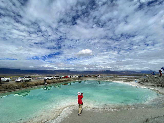大量的盐份在湖水中结晶,形成一道道不规则的凸痕,奶白色的湖水,白色的结晶体,勾勒出一幅幅美丽的画面。