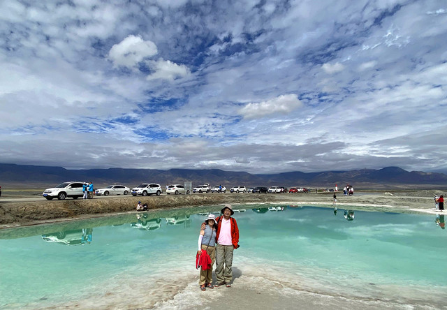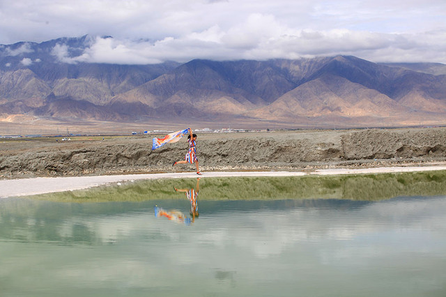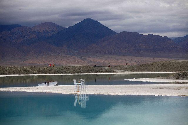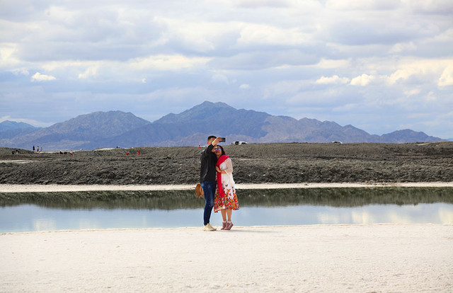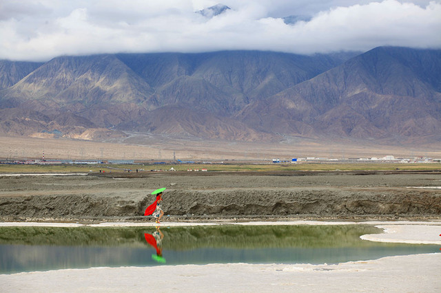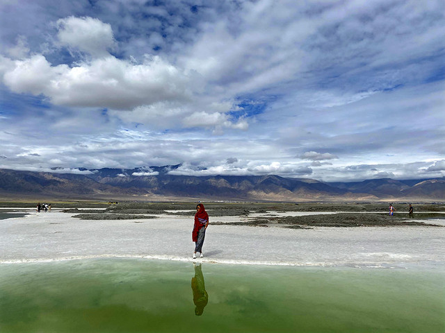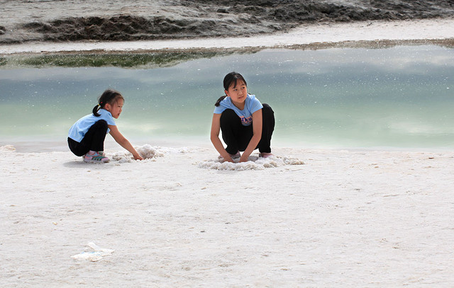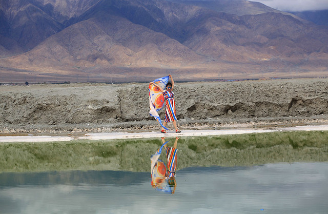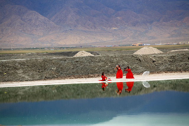 这里到处都是盐,湖底是盐,湖岸也是盐,那浅滩、那堤坝,处处是耀眼的白色,艳丽的服饰在水边移动,那种对比,那种夸张,简直漂亮极了!