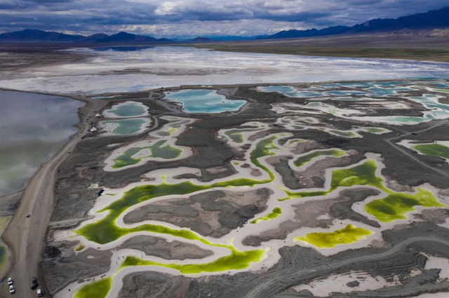 这里是原大柴旦化工厂盐湖采矿队的采矿区,经多年开采,留下的坑洞积水形成了如今的湖泊群,由于湖水所含矿物质不同,便形成了不同颜色的湖面。同行摄友尔东航拍的照片异常震撼,湖泊形状各异,颜色各不相同。
