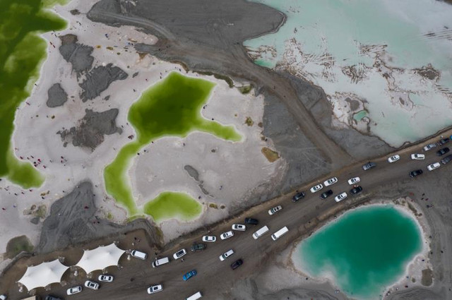 跨过公路,是一片黄绿色的湖水,人们在湖畔做出各种夸张的动作,留下自己美丽的一瞬。