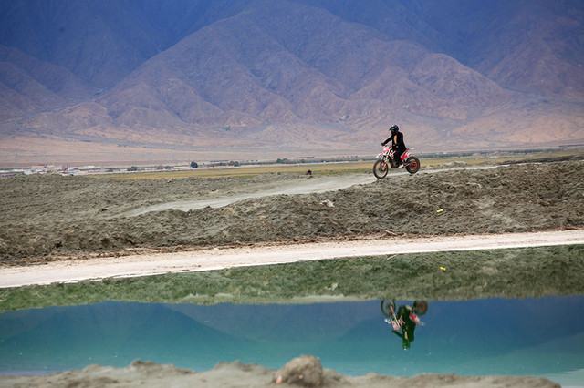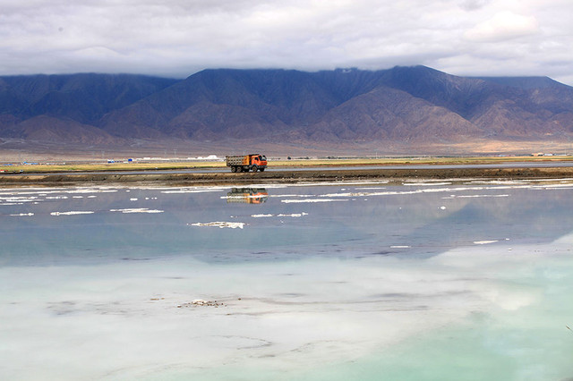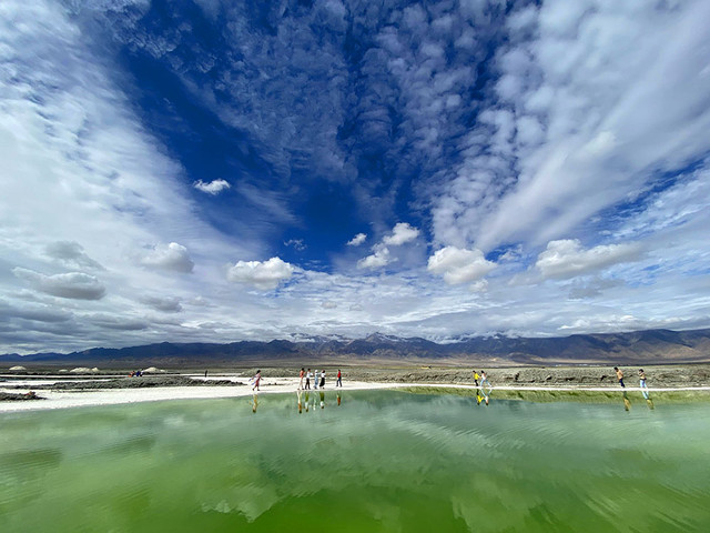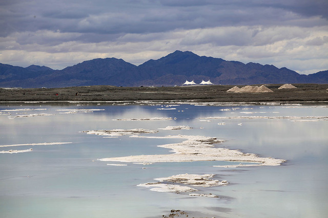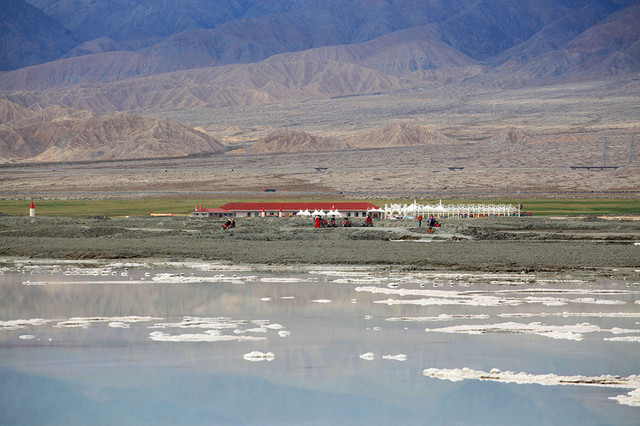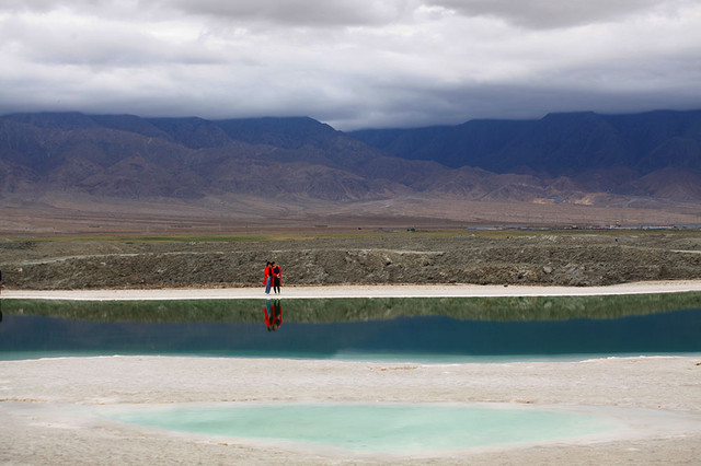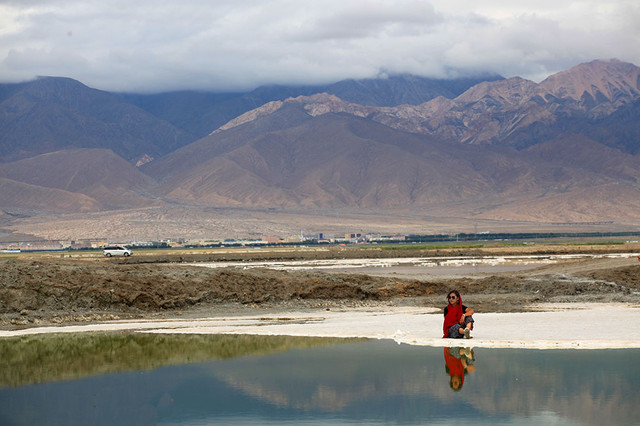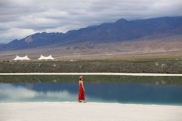 盐湖在山间平原点缀着,远处是巍峨的群山,大山倒映在湖水中,给洁白的湖水平铺了一层青黛,那种突兀插入的色调,给画面平添了许多稳重。