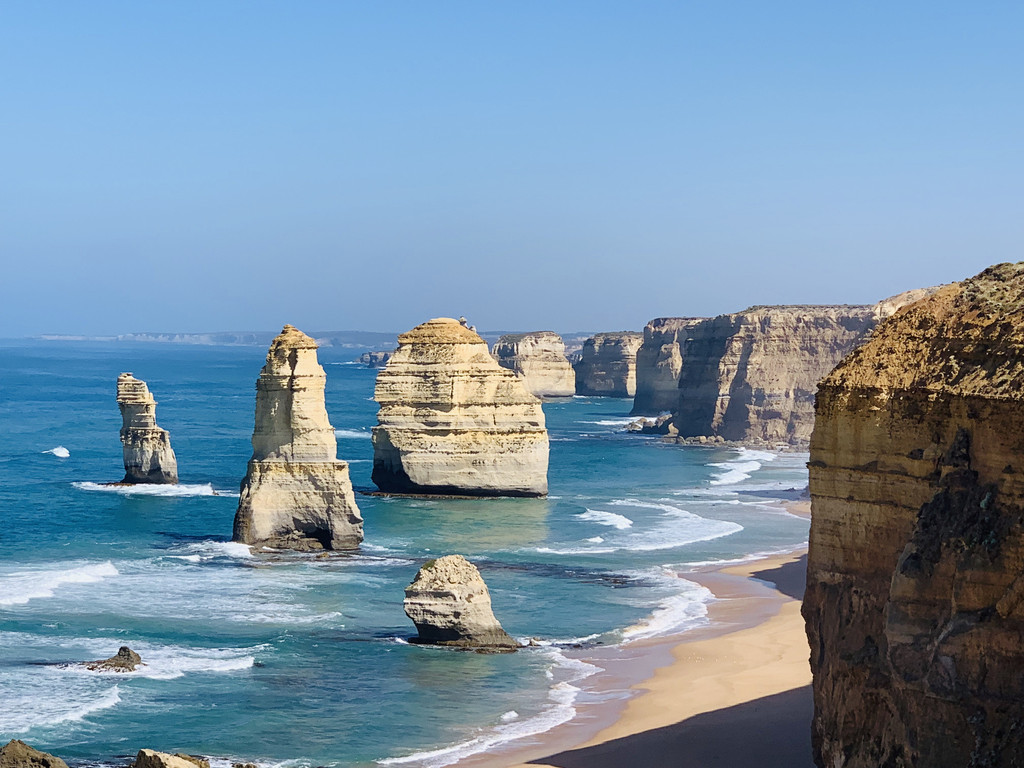 领略了吉普森大风大浪之后,我们来到了十二门徒,这是大洋路最壮丽的海上风光,也是服务最完善的景点,这里有大型旅客服务中心。你可以坐直升机鸟瞰,也可以走到海边瞭望台近距离观看。站在岸边,“十二门徒岩”犹如一排海上巨人竖立在你眼前,有的高大威猛,有的纤细小巧。你不用纠结为什么叫十二门徒,其实,当地人最早称谓他们为“母猪和小猪”。这里最早也只有八块巨石,历经千万年海水侵蚀,2005年,已经倒塌一个,目前还剩七个。