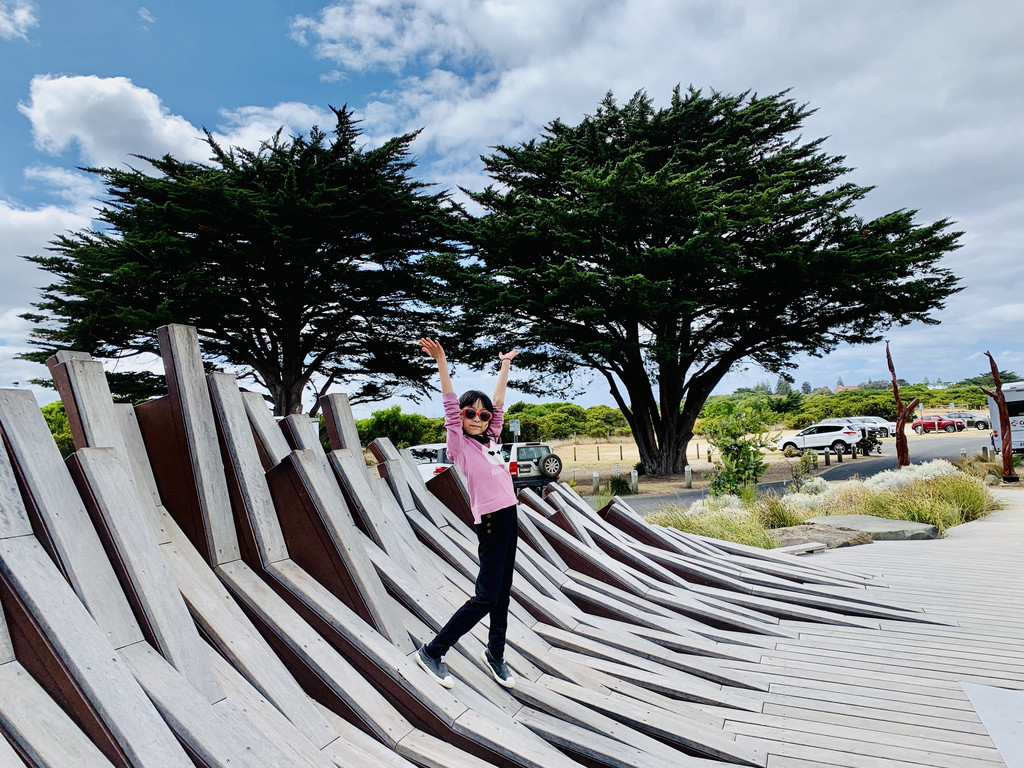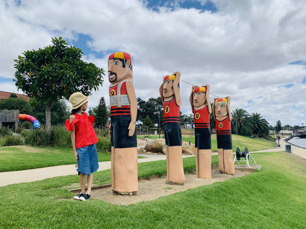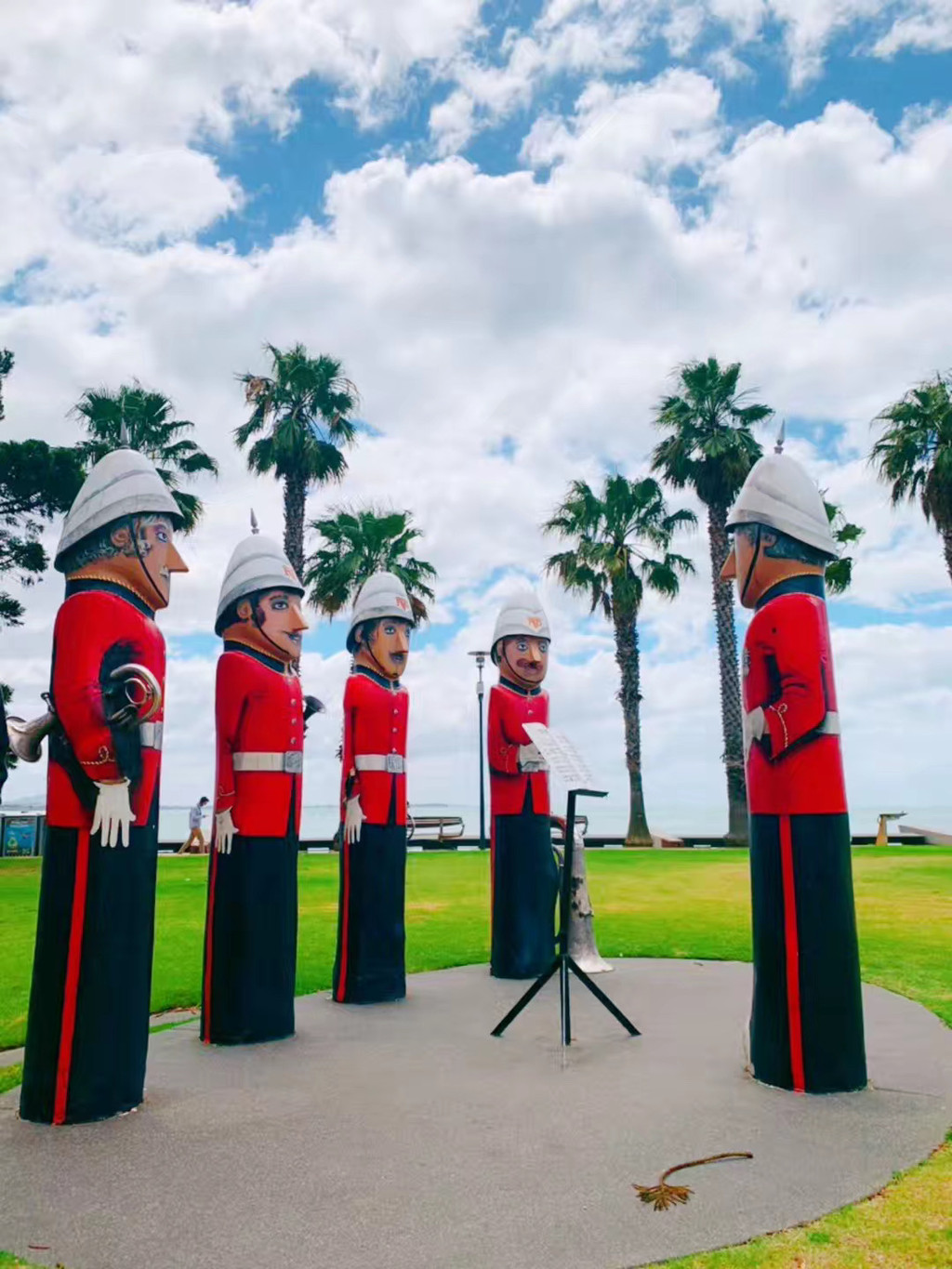 经过一个半小时的车程,我们来到了吉朗海滨Cunningham Pier停车场。从车上下来,眼前竖立着多尊颜色鲜艳的人偶。由于喜欢画画,荳公主对这些木偶非常感兴趣。一会儿瞧瞧这个,一会儿摸摸那个;一会儿带领木偶齐步走,一会儿指挥乐队演出。据说,木偶原来只是拴船的木头,后来艺术家们把他们变成了吉朗的标志。