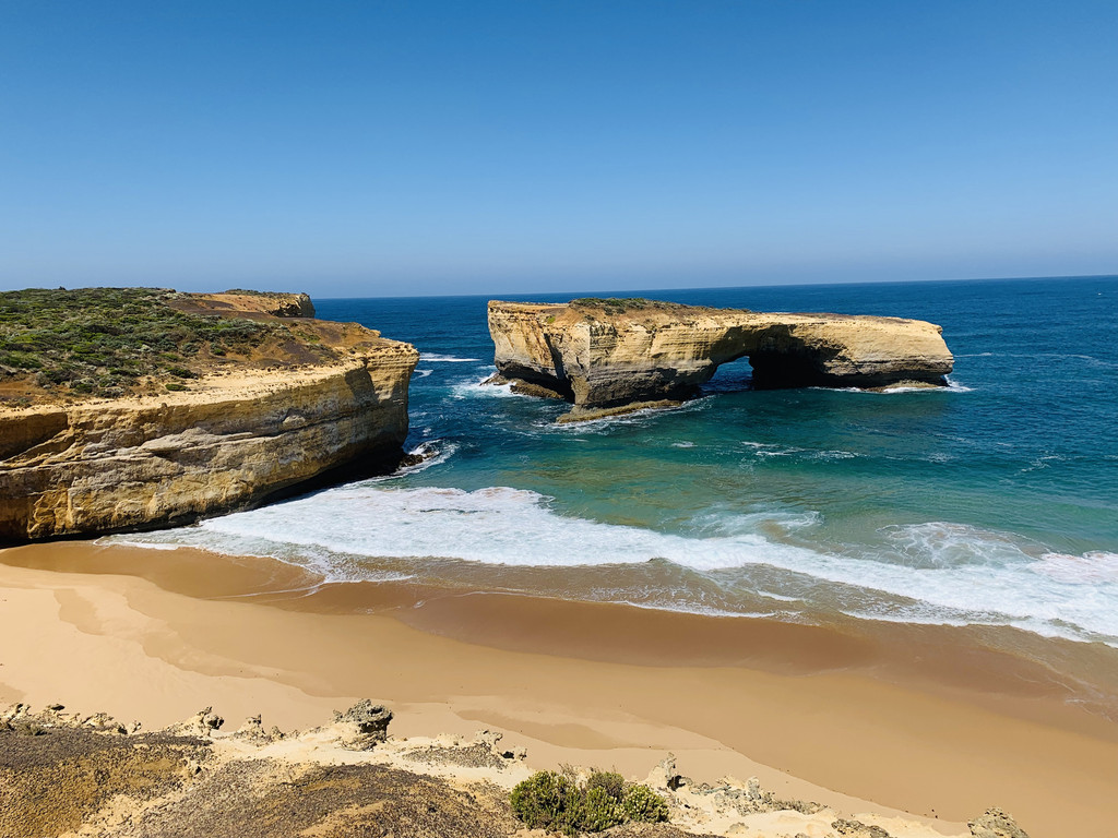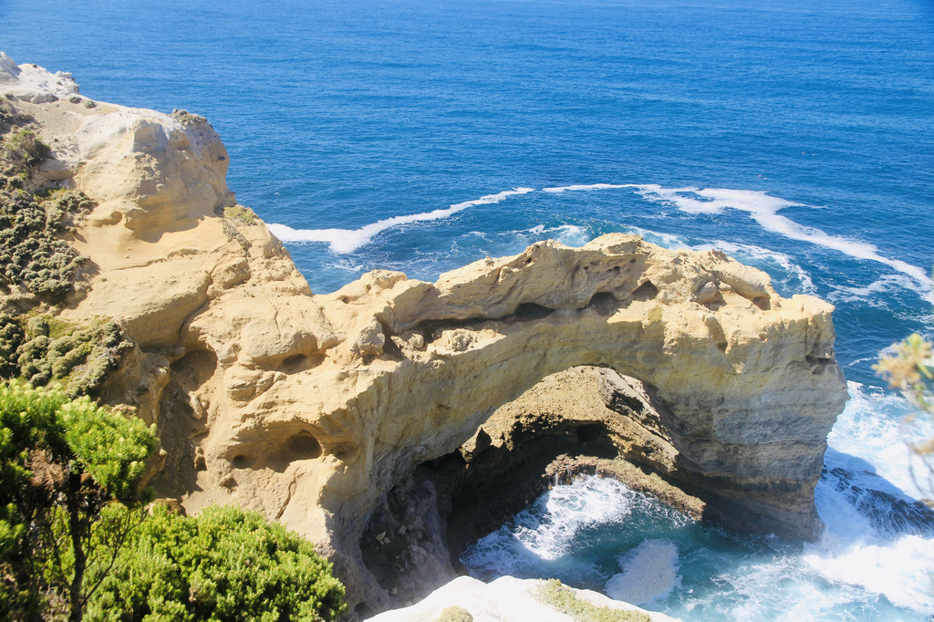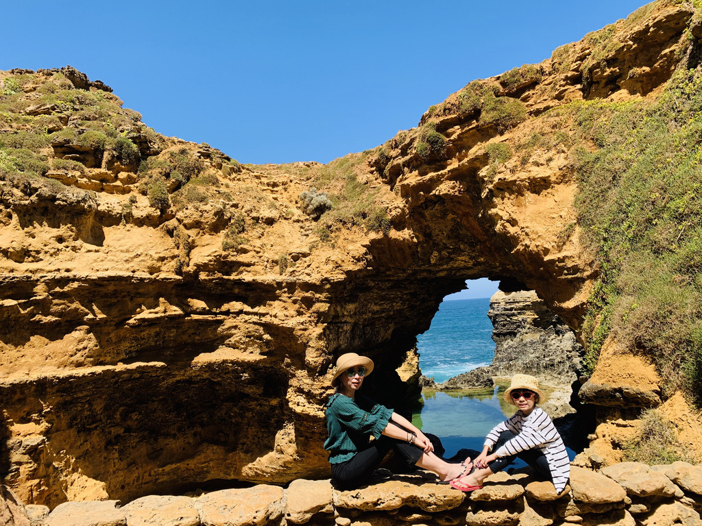 在明媚的晨光中,我们开启了大洋路第三天行程,为了弥补昨天下午逆光拍照的遗憾,我们再次奔赴十二门徒,海面波光点点,岩石上披上一层薄薄的晨辉,我们能做的就是摆pose、按快门,一顿狂照之后,开始今天第一个景点——拱门(The Arch)。拱门,是由于海水亿万年的不断拍击冲刷腐蚀岩石而成。站在高处,大门在海浪的拍击下发出强烈的撞击声,仿佛在为凯旋归来的战士鼓掌欢呼。