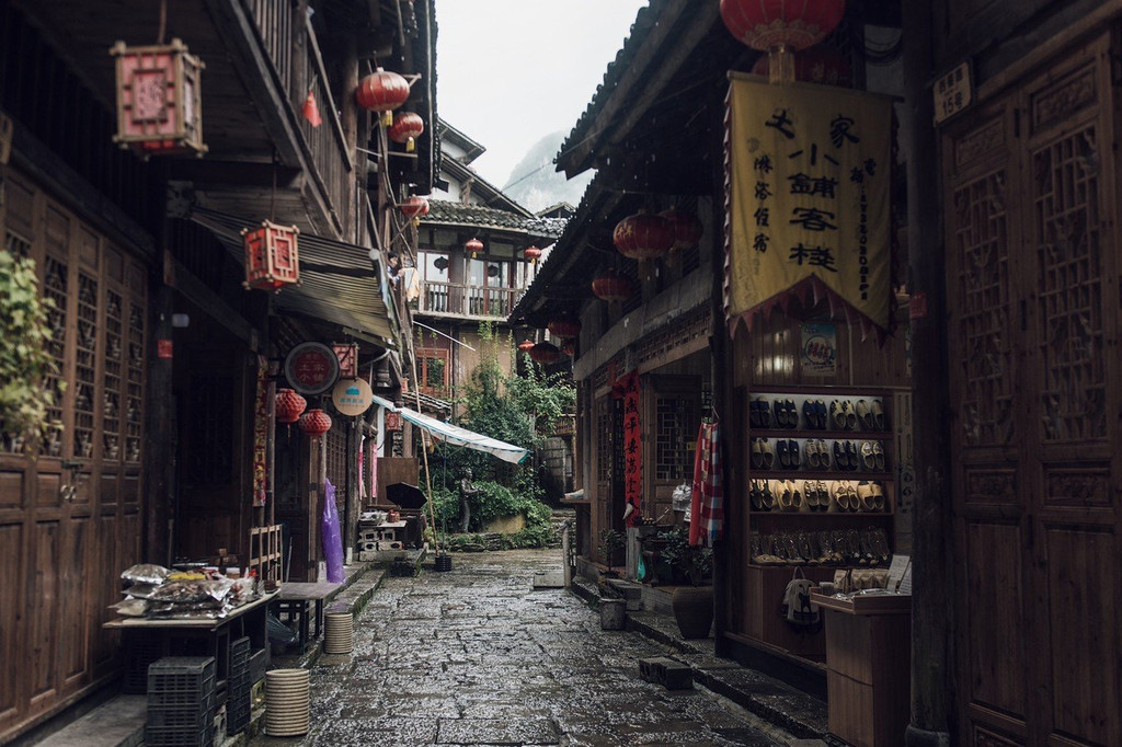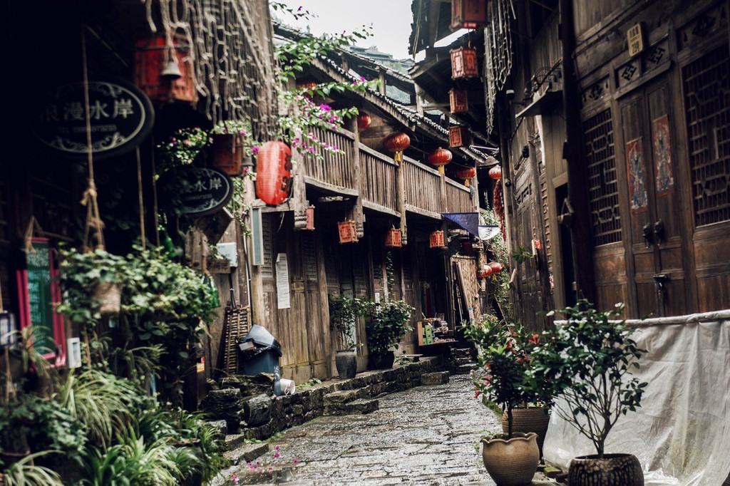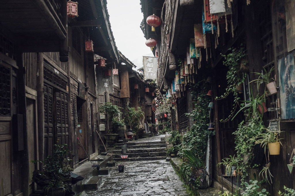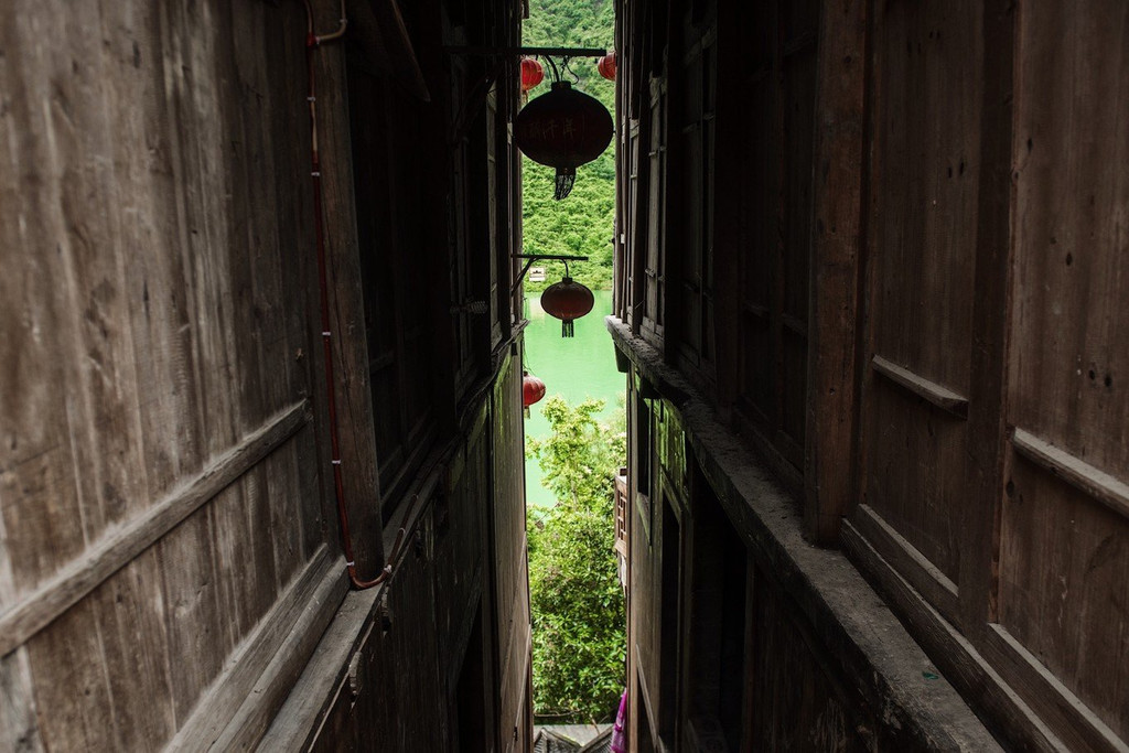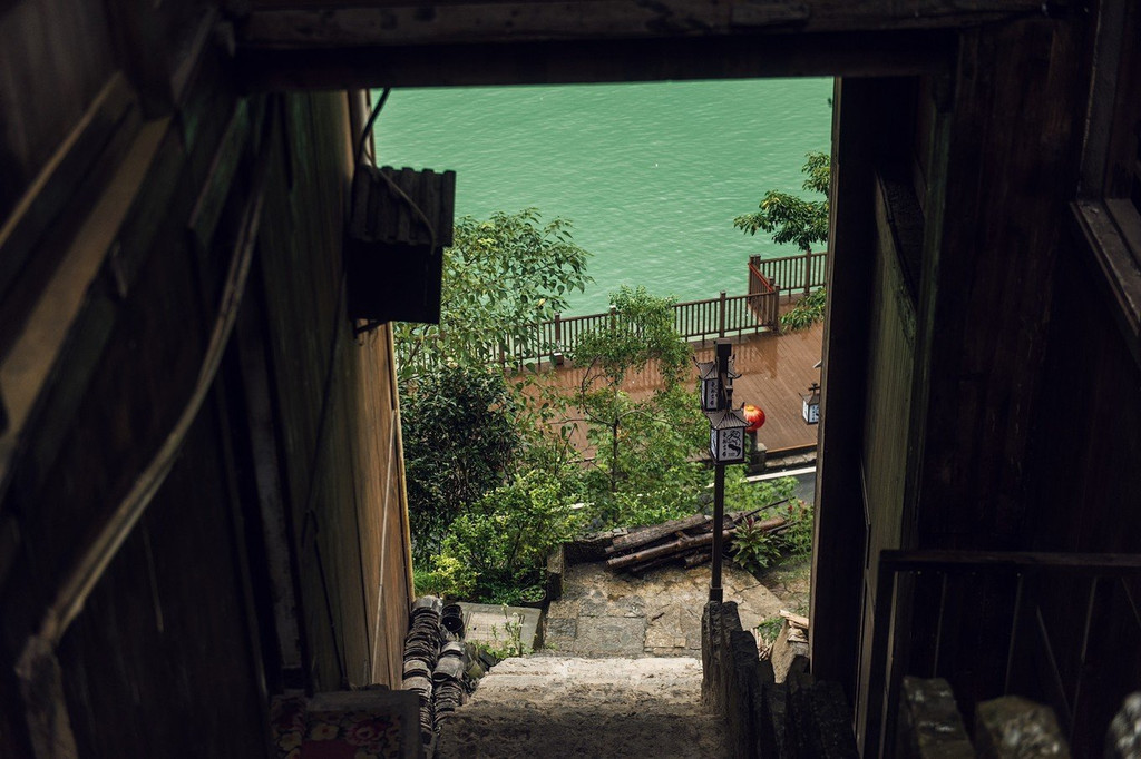 吊脚楼之间的窄道,就像一副挂着山水画的相框,勾勒着自然的美景。
