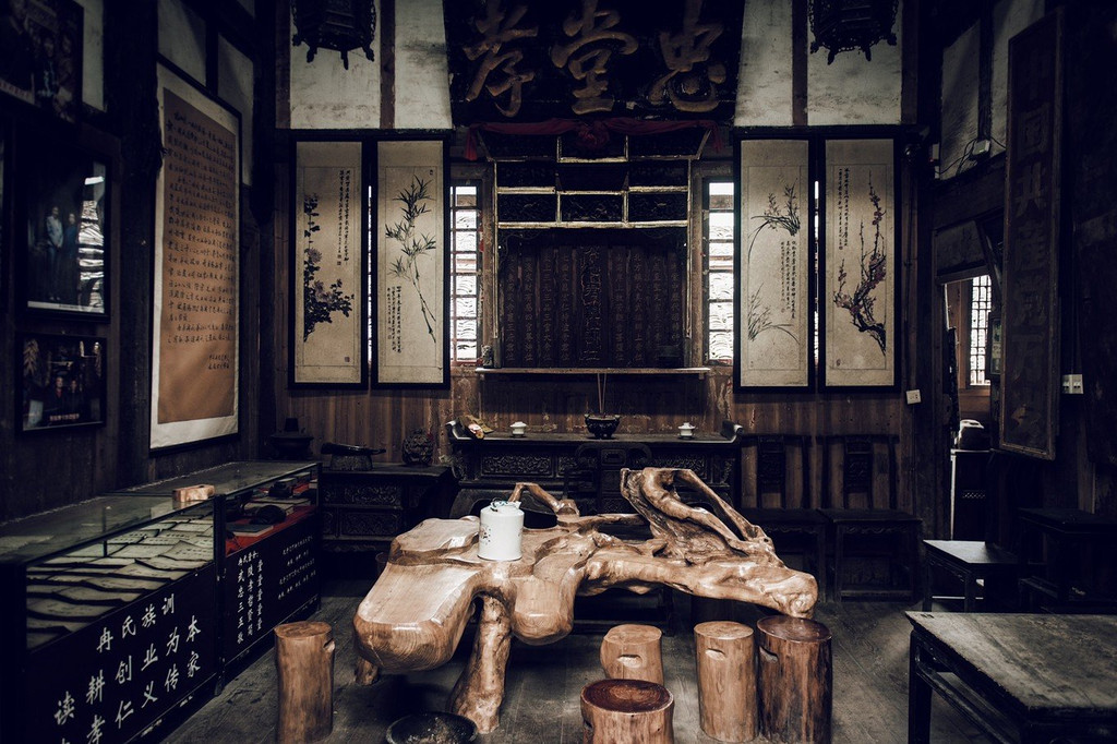细看这座房屋的设计,闲情逸致的装饰,摆放着许多陈年旧物,比如木质的桌凳、青花陶瓷茶壶、铜器烟杆...进入其中,有一种徽派民居的感觉。但是与徽派民居不同,它一面是开放的,吊脚楼廊伸向街面,正房和厢房都是穿斗式结构,是龚滩地道的建筑风格。
