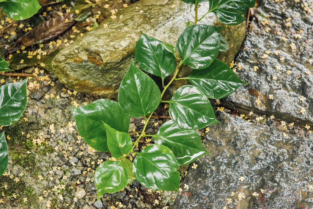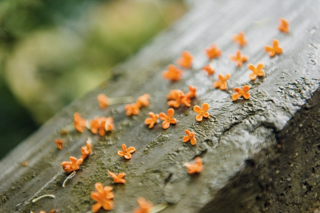被雨滴打落下来的金桂散落在树叶上、地面中,发出一阵阵清雅扑鼻的香气,愉悦着游人的心情。不免想起“桂子月中落,天香云外飘“的意境。金黄细小的花儿显得格外迷人。