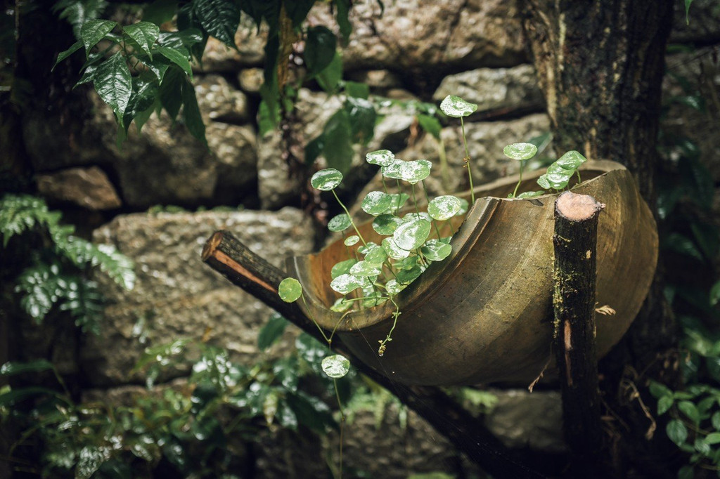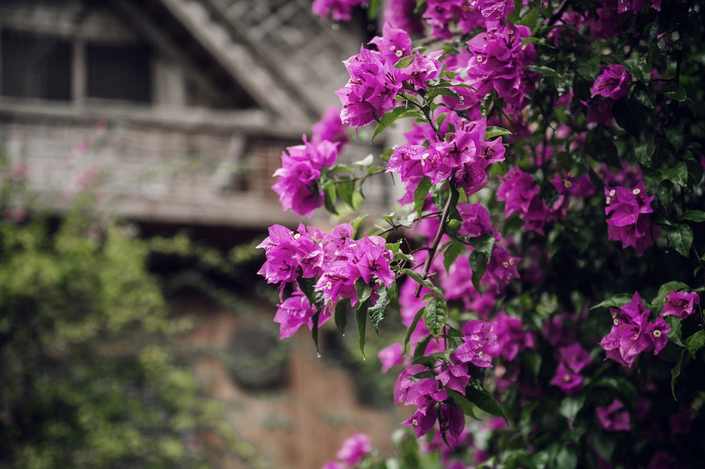 处处盛开的三角梅及一些不知名的绿色植物盘旋于屋子与石头之间,高低错落、疏密有致。