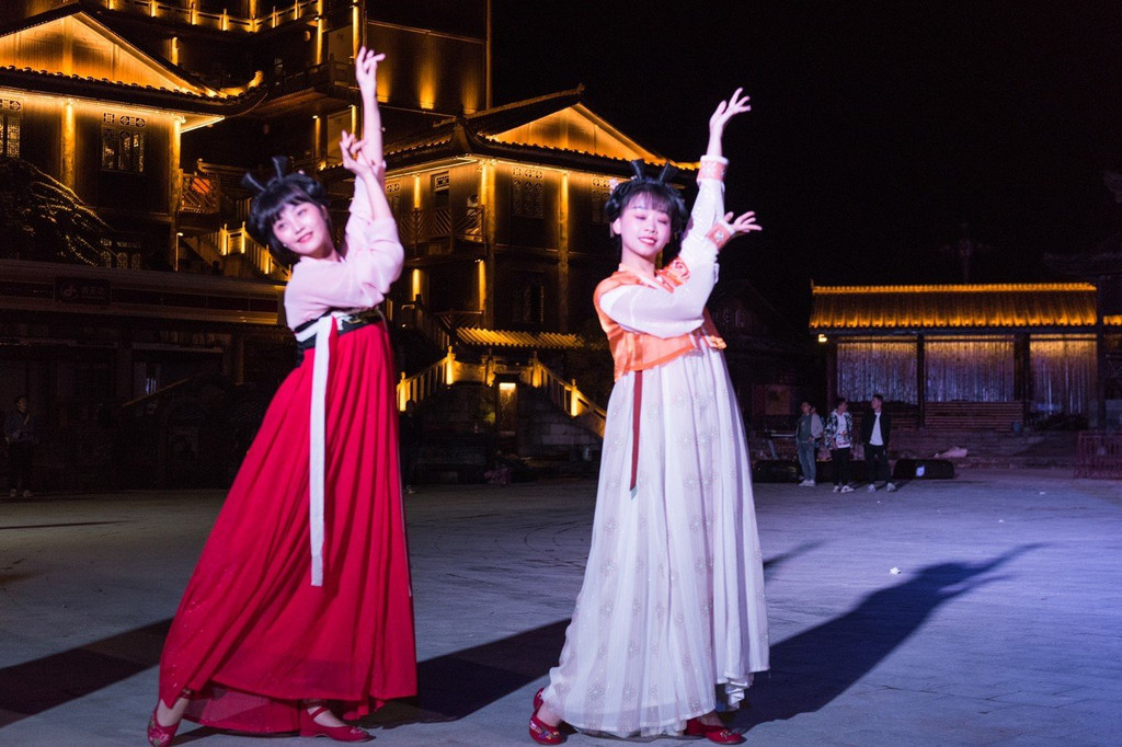 我们当时还看到了一群穿古装的小姐姐,里面有各种电视剧里才能看到的角色,比如猪八戒、乞丐、仙女等等,有一种时空穿越的感觉,上前询问得知他们在彩排酉州古城亮灯节的活动。