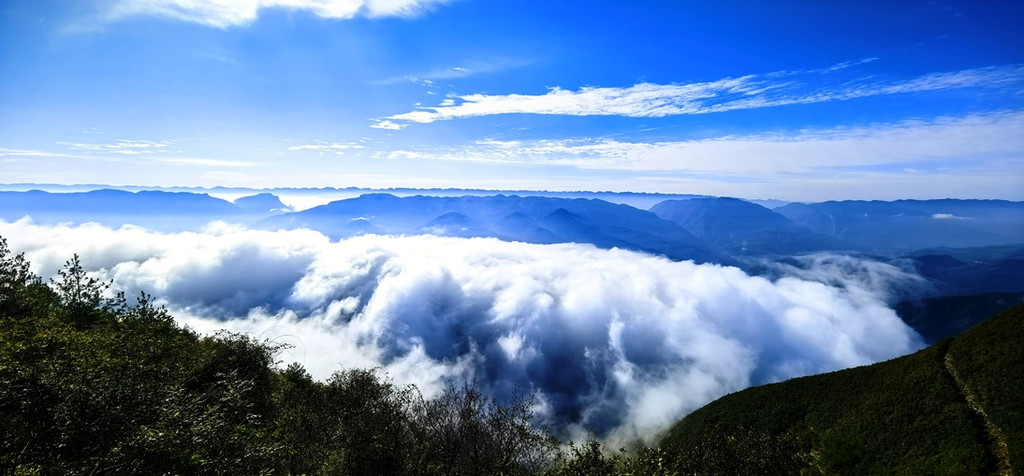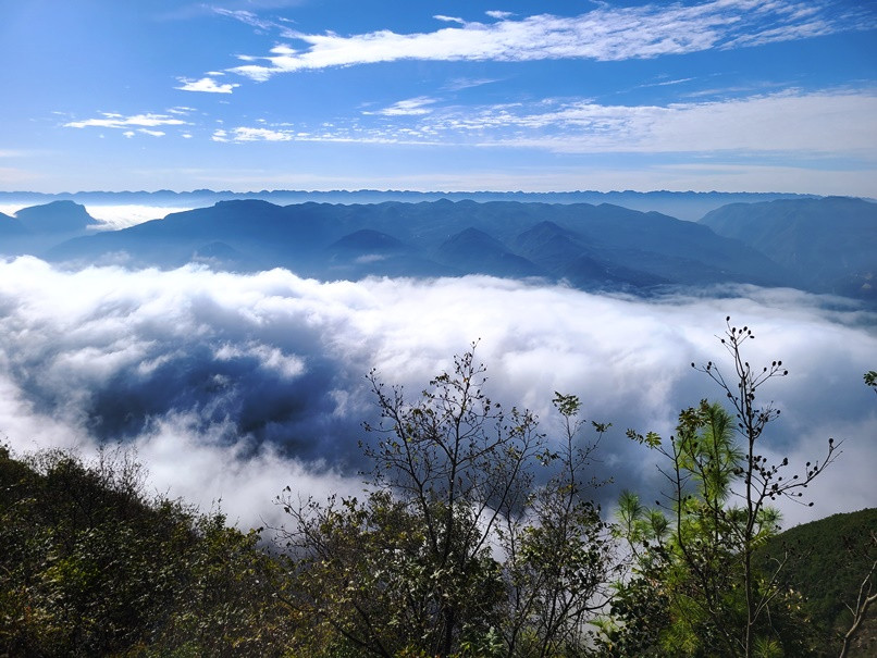 清晨的三峡之巅,滚滚的云海在山间翻卷奔涌。天气好时在三峡之巅山顶可看到云海,这也是最好上午游览三峡之巅的收获之一。