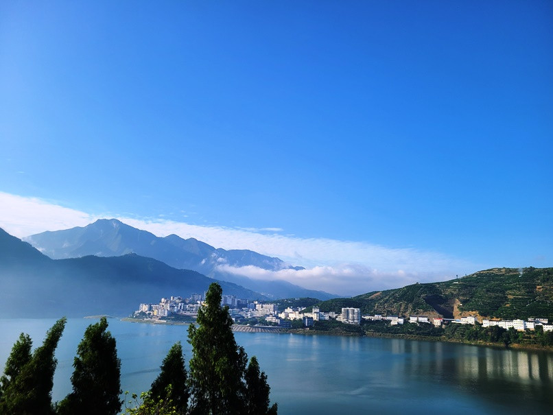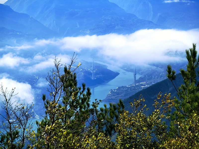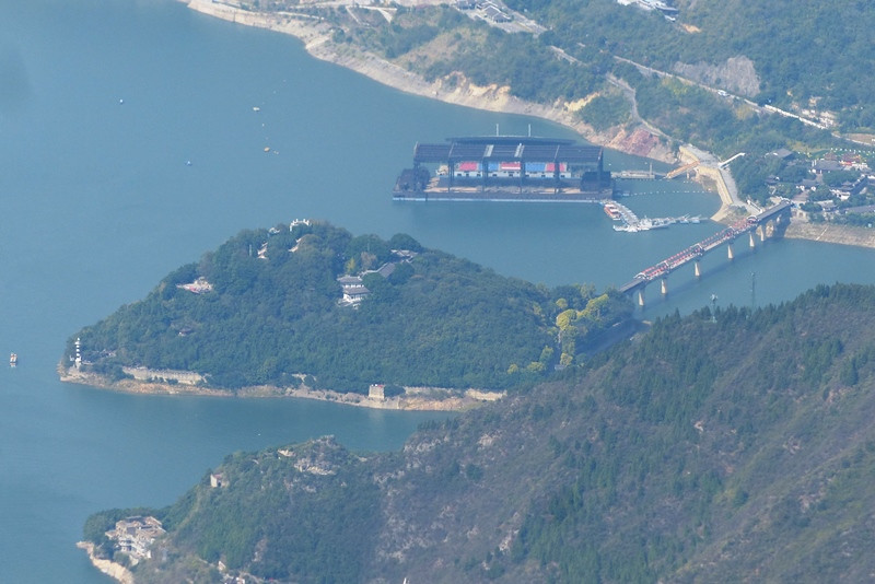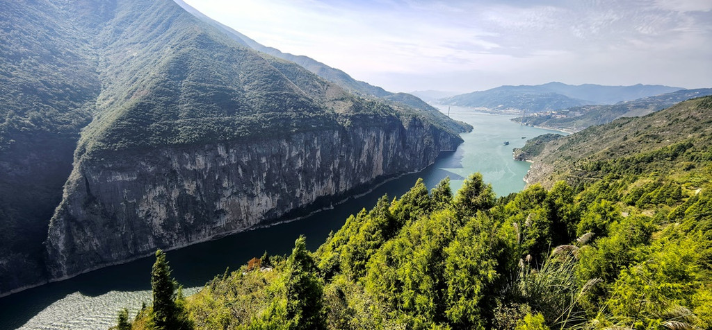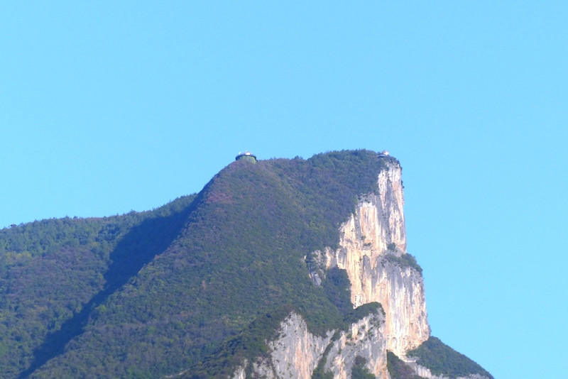 从三峡之巅山脚下的瞿塘峡观景台遥望三峡之巅。