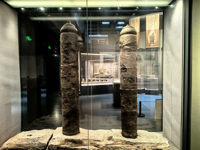 夔州博物馆内的锁江铁柱和铁柱铁索锁江示意图。