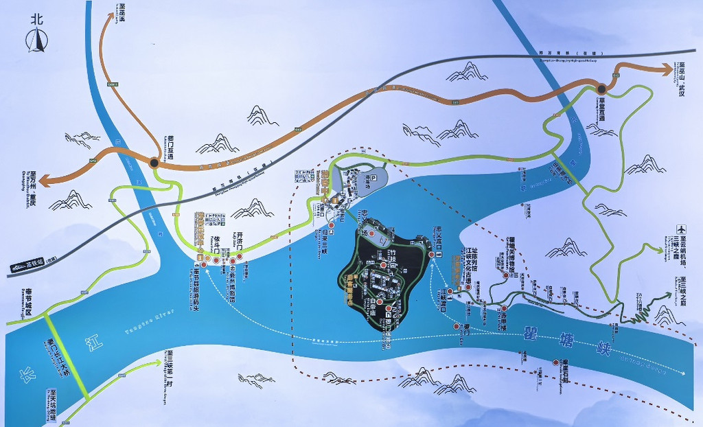 从下图可见连接长江北岸与白帝城的风雨桥,从瞿塘峡景区徒步登三峡之颠的路线,从白帝城驾车前往三峡之巅的行车路线。