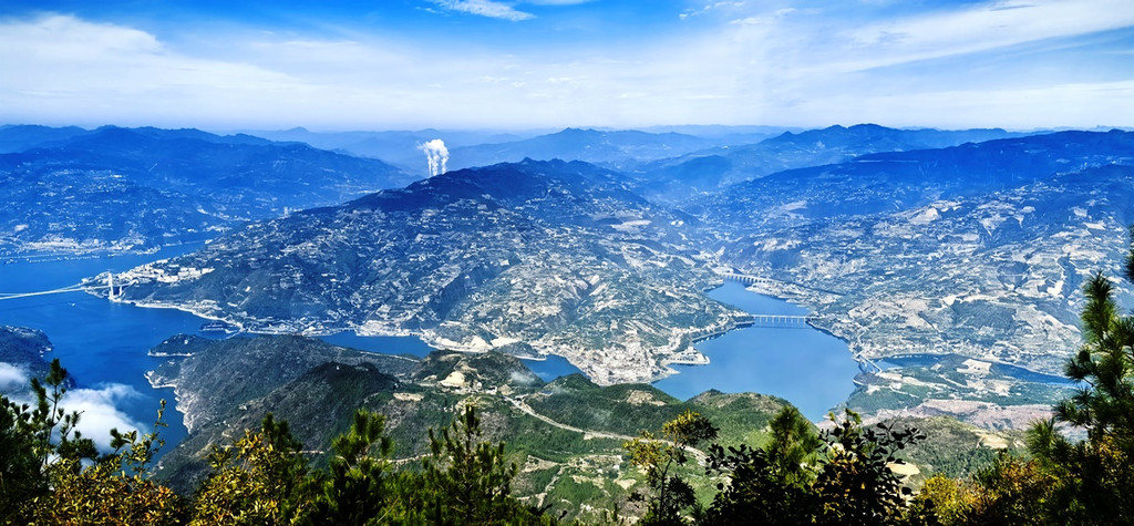 站在三峡之巅,遥望远方,蓝天白云,青山绿水,山河壮丽。