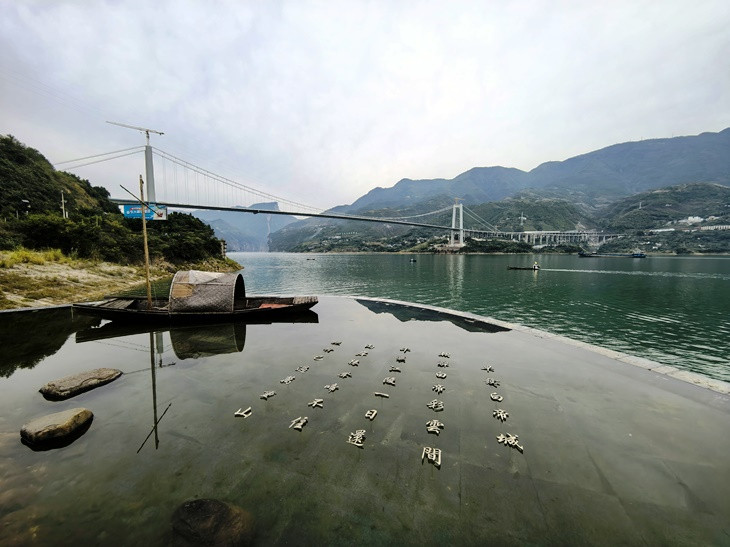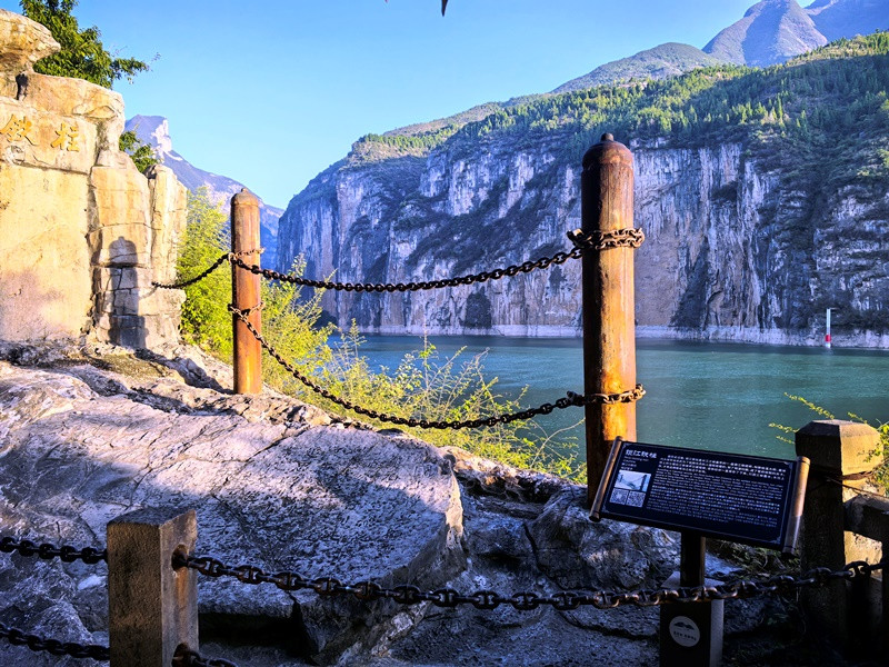 瞿塘峡景区赤甲山瞿塘峡口设有古代锁江防御设施—夔门锁江铁柱。