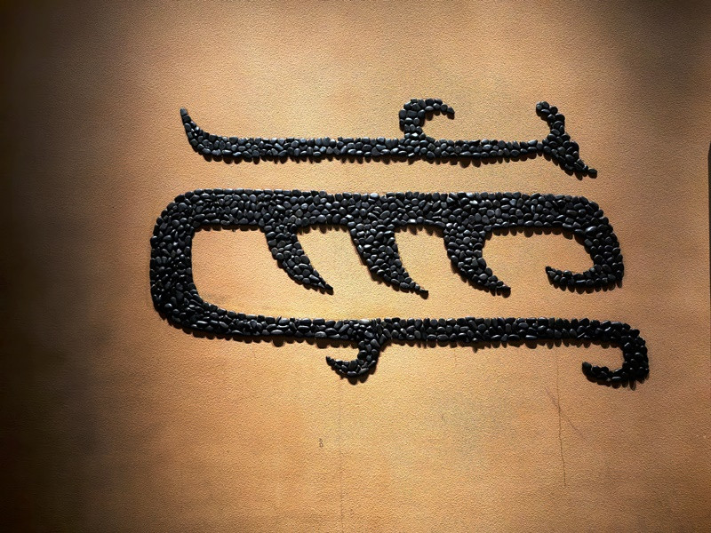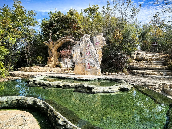 汉白玉浮雕后夔塑像前的水池上,十三块排列酷似“夔”字笔画演变的石块是神夔的图腾。