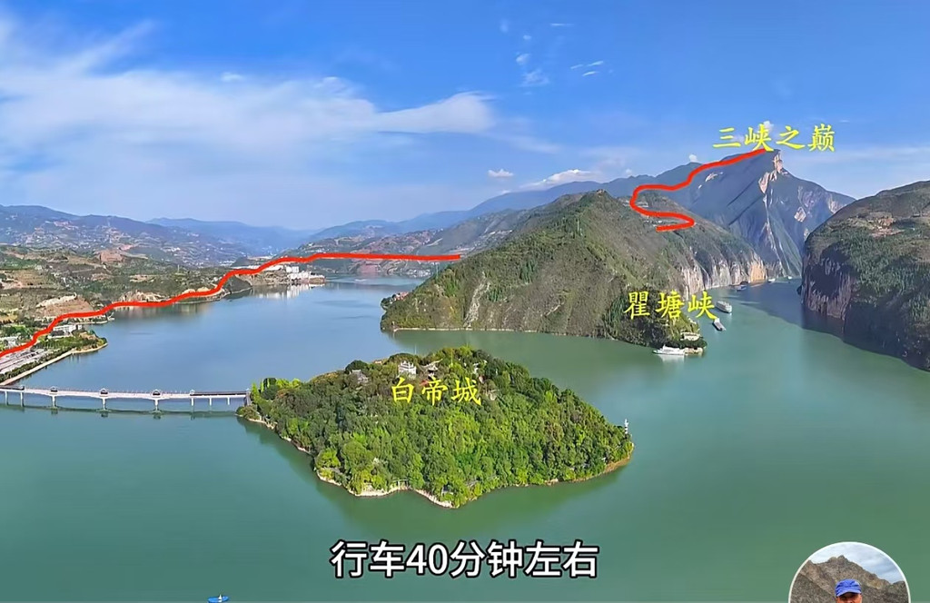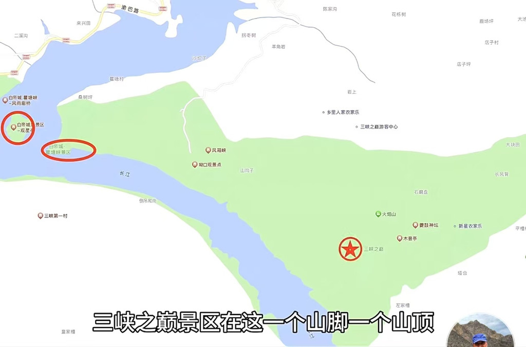 下图中红色圆圈内是白帝城,红色椭圆形圈内是瞿塘峡景区,红色五星处是三峡之颠。