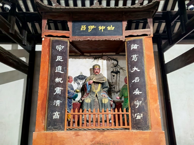 榻上躺着的是刘备,榻前左边站立的是诸葛亮,右边持剑站立的是赵云。对诸葛亮跪拜的是刘备的二个儿子—刘理(梁王)和刘永(鲁王),虽然托孤托的是后主刘禅,但此时刘禅在成都,没有在场。