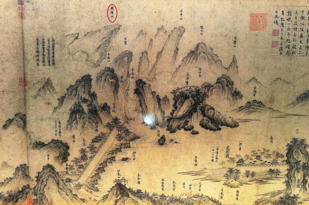 在宋代著名绘画《蜀川胜概图》(原件藏于美国华盛顿,相传为北宋名家李公麟所作,最为乾隆帝欣赏)中,图中标注为“猪头山”(红圈处)的山峰就是现在的三峡之巅。图中左下侧的建筑群是瞿塘关,左下侧的建筑群是白帝城,底边正中的永安故宫就是当年刘备托孤的永安宫(遗址已被淹没)。