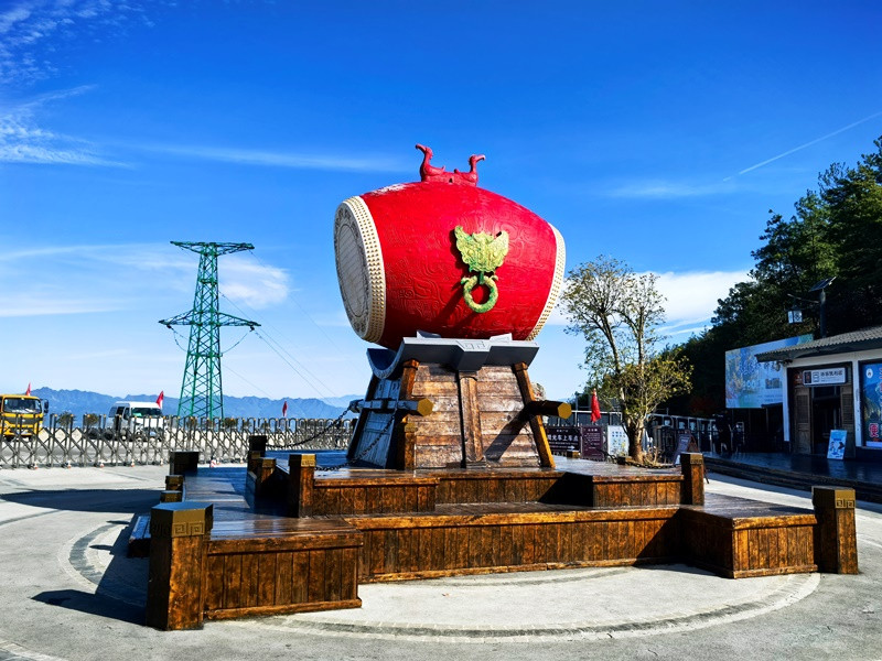 景区入口处的夔鼓广场。广场上有一个巨大的夔鼓,夔鼓是黄帝大战蚩尤时制作的战鼓。