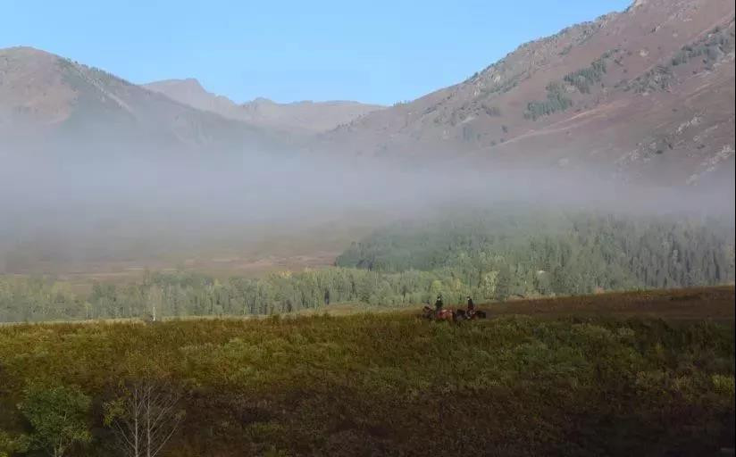 太阳努力地爬出这浓浓的晨雾,晨雾极不情愿,但又不得不离去。一回身,两匹骏马在晨光中追随晨雾而去。