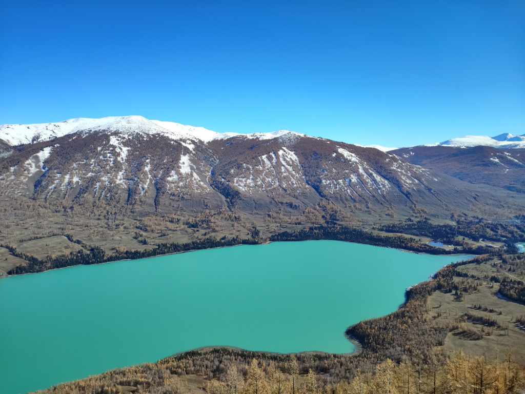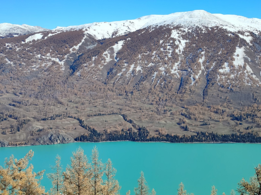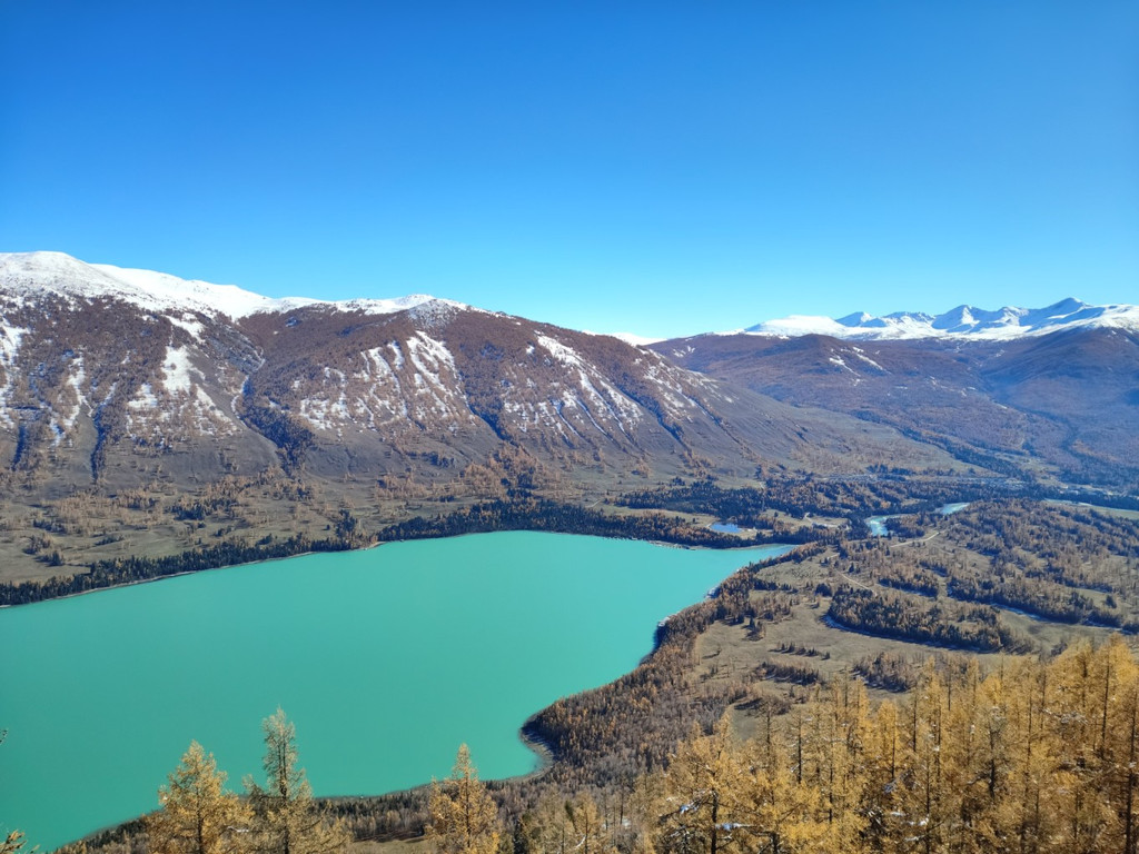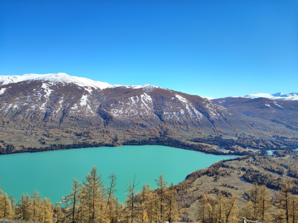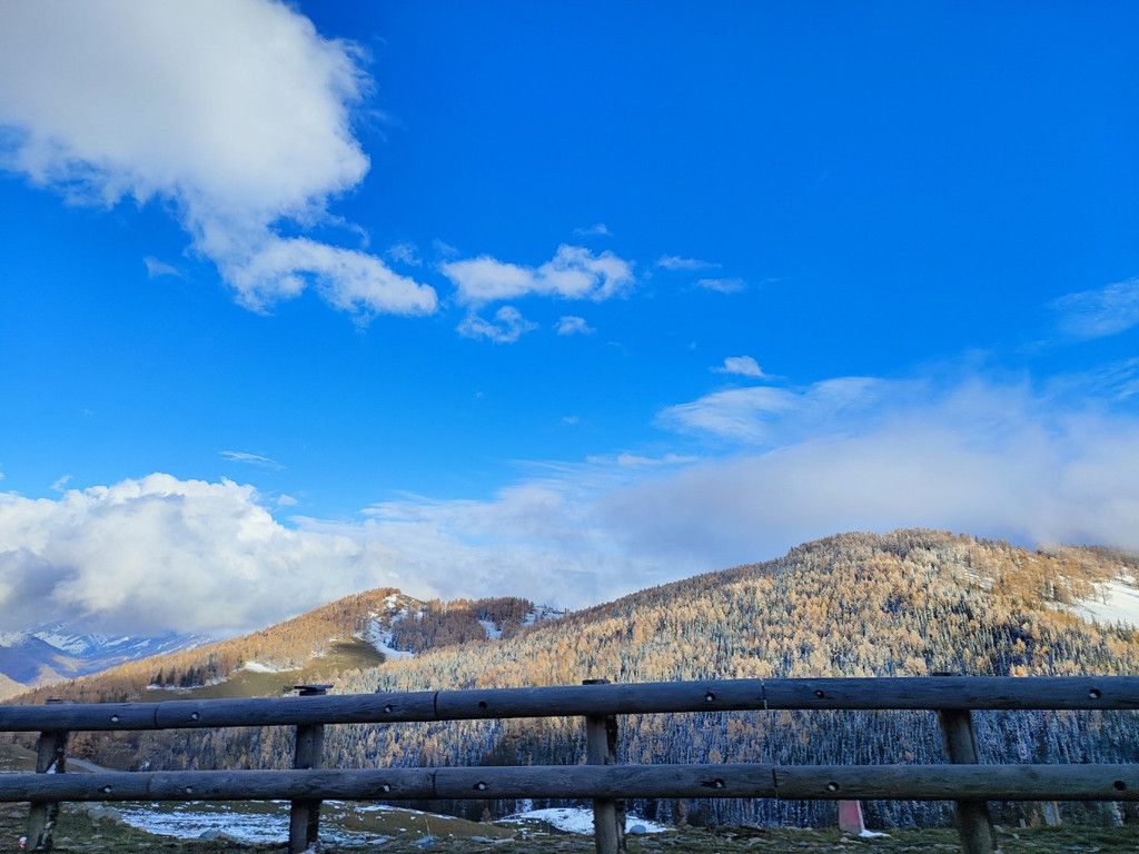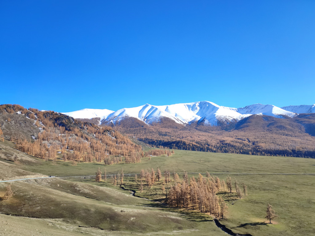 开车前往 白哈巴 ,途径经过空中草原,有观景台居高临下,这是我这几天来看过的最美草原了,草还是绿色的,斜坡上则有成片的 新疆 落叶送已呈褐黄色,山顶依旧是皑皑白雪。
