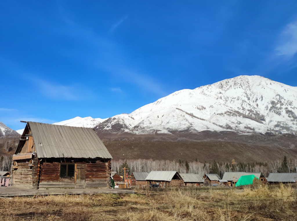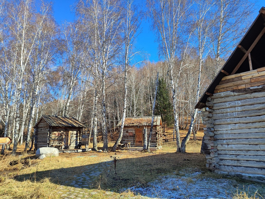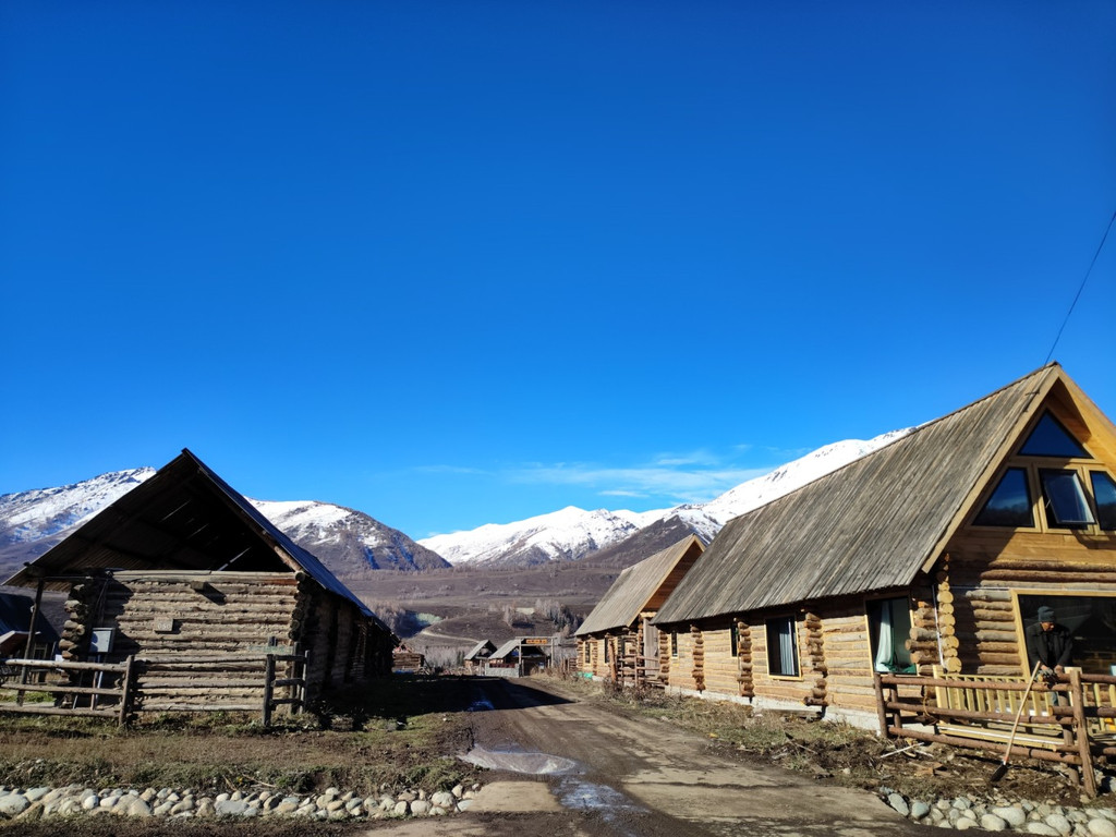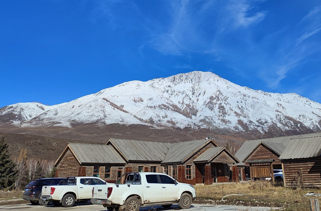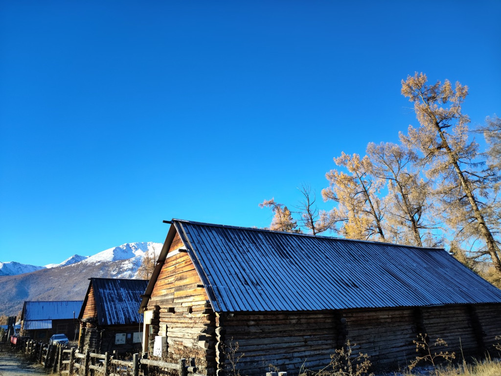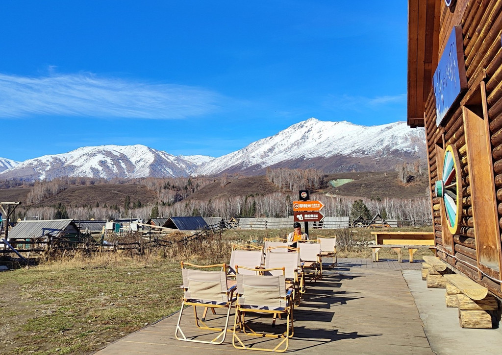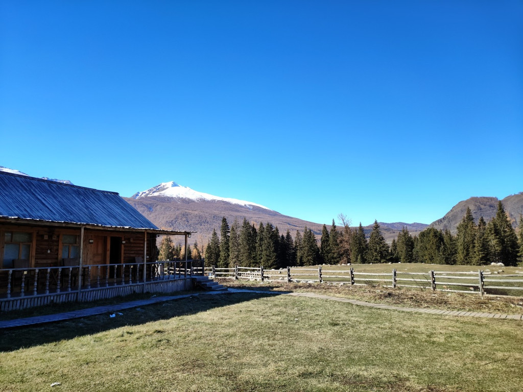 沿着村子最南侧步行回北边的民宿,沿路欣赏雪山和木屋,还有白桦林。民宿老板帮忙约车去 喀纳斯 ,淡季不太容易约到。