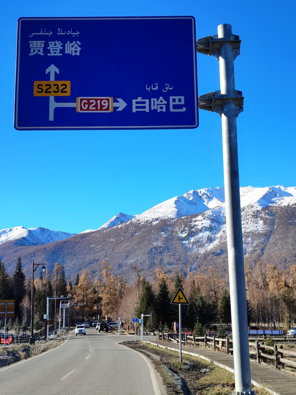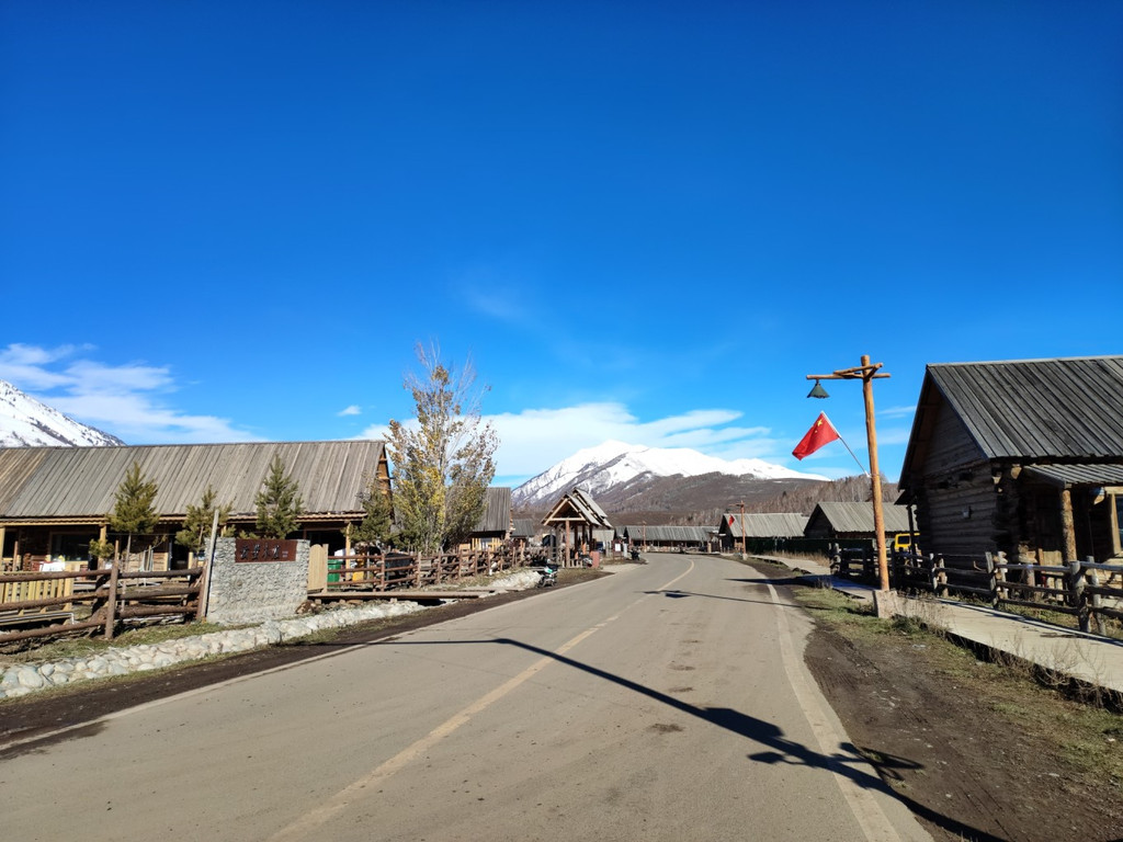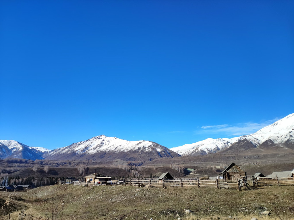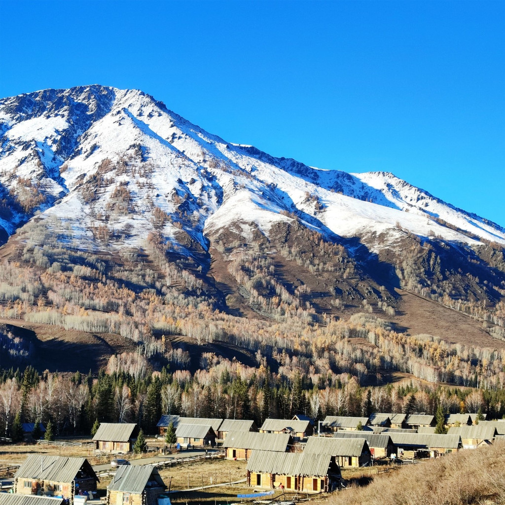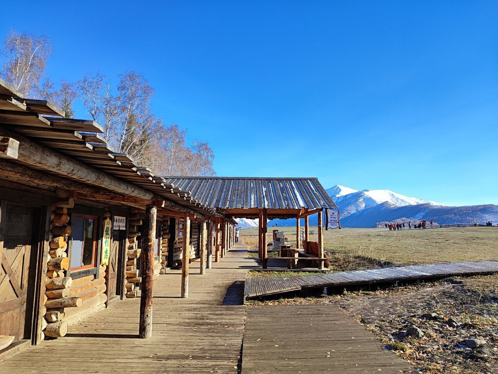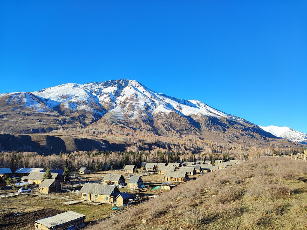 沿着村子最南侧步行回北边的民宿,沿路欣赏雪山和木屋,还有白桦林。民宿老板帮忙约车去 喀纳斯 ,淡季不太容易约到。