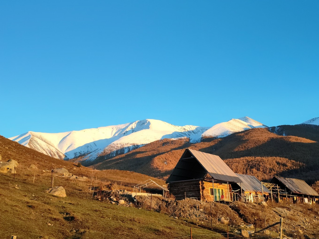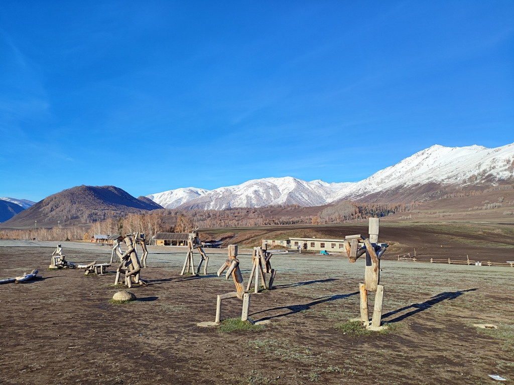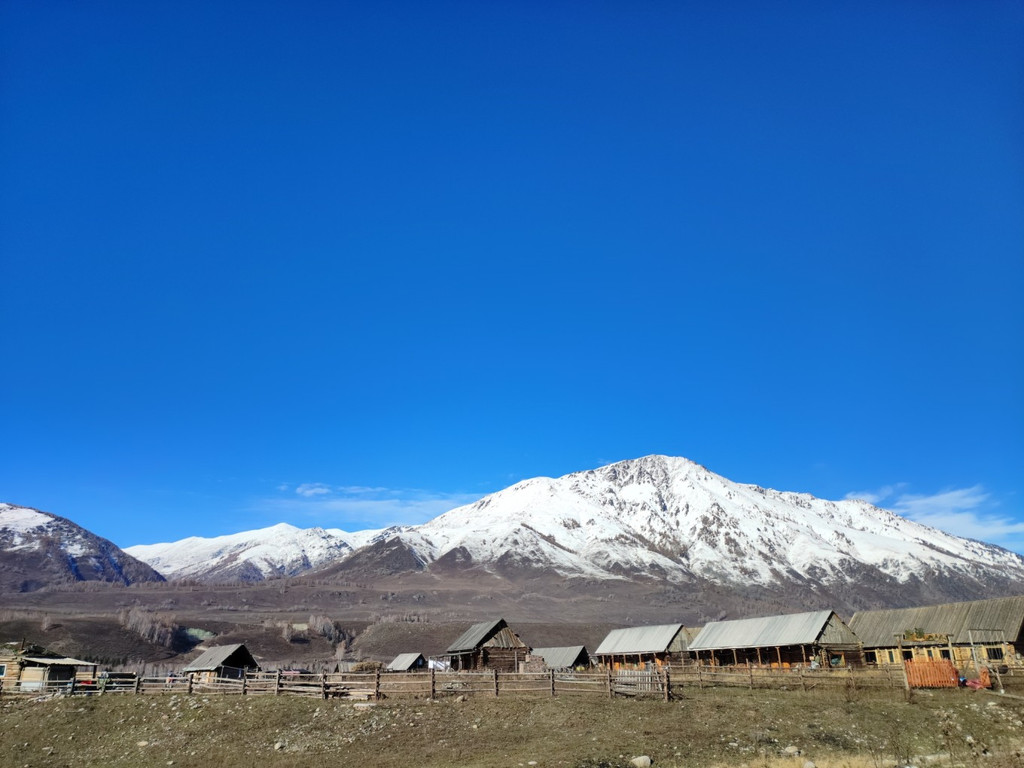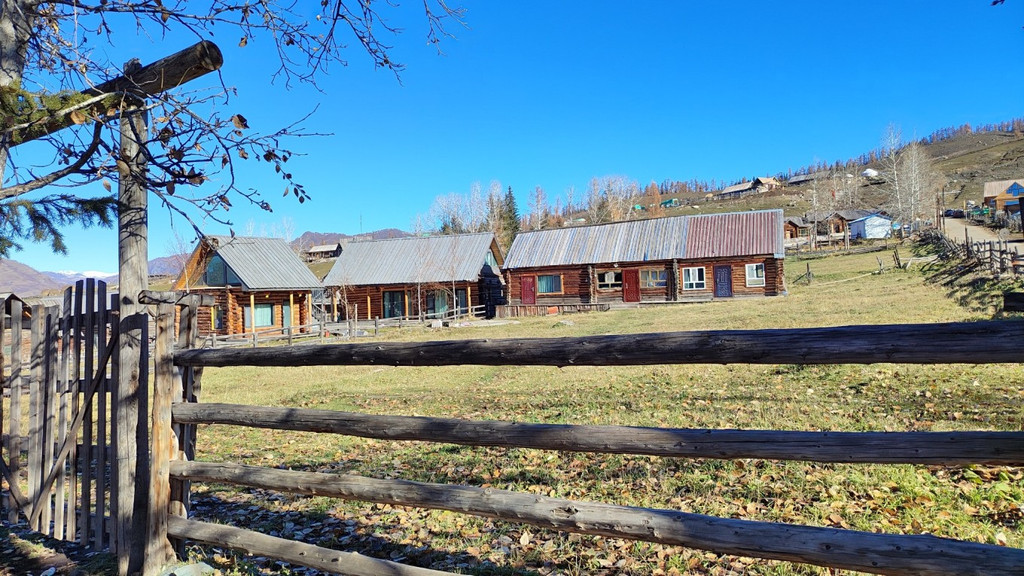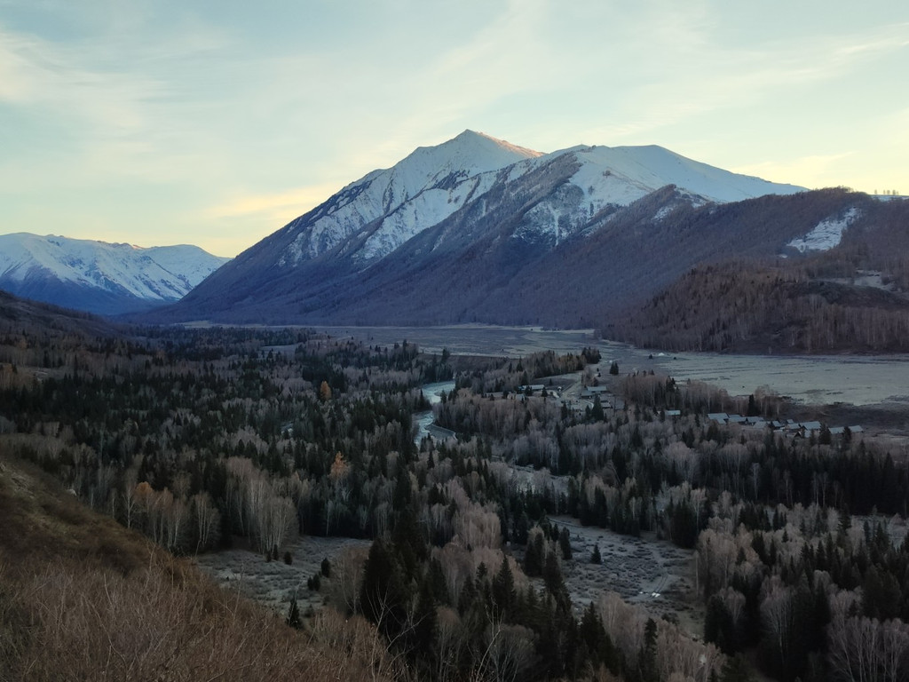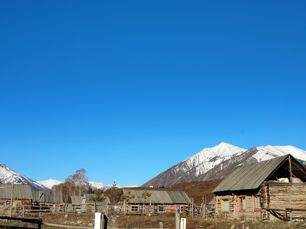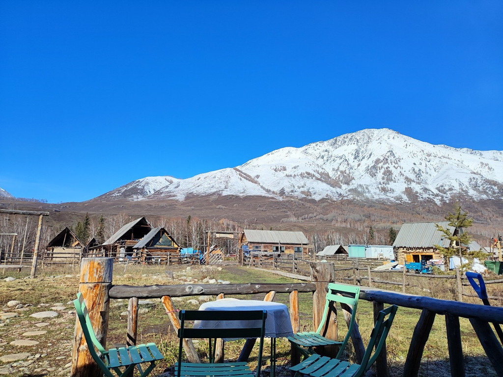 沿着村子最南侧步行回北边的民宿,沿路欣赏雪山和木屋,还有白桦林。民宿老板帮忙约车去 喀纳斯 ,淡季不太容易约到。