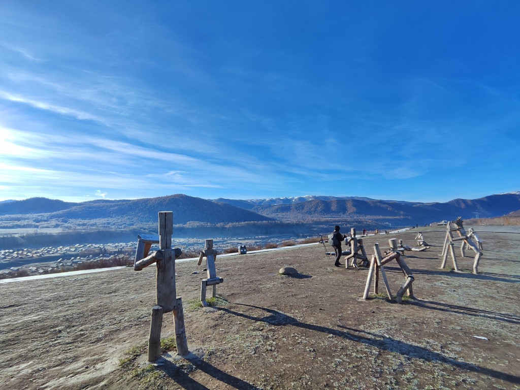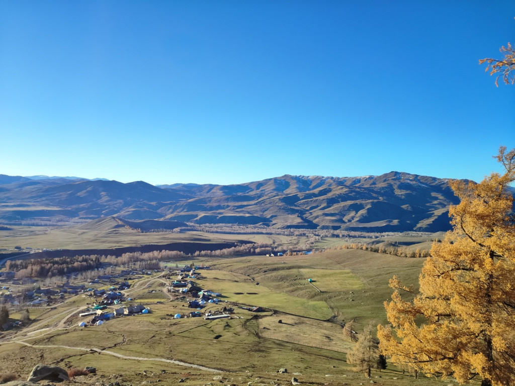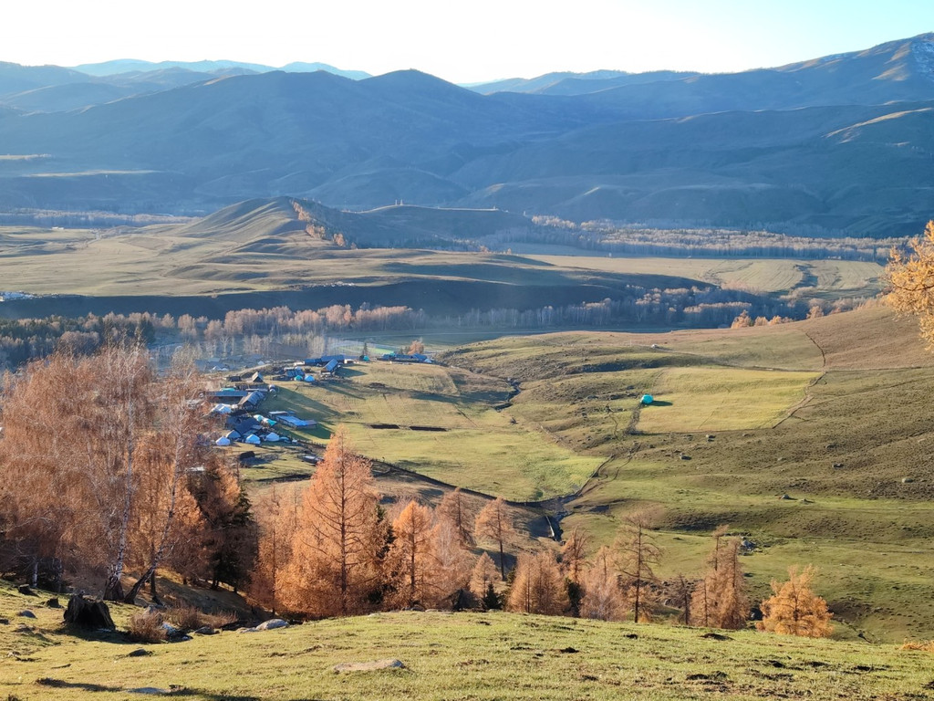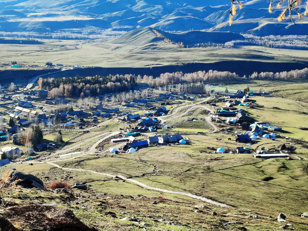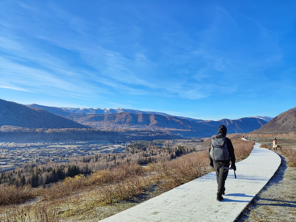 跟姐一家子道别,非常感谢。姐一家子沿着中哈边界开回 布尔津 ,我留在村里,入住山脚的民宿,放下行李出门爬后山的木栈道。