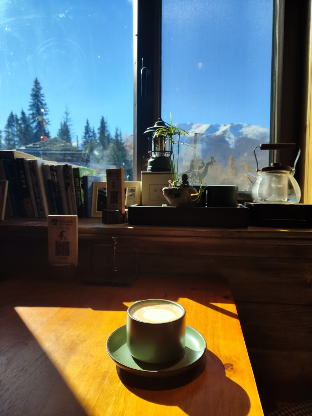 到 喀纳斯 ,订好民宿入住后,连同卡卡,三人一起出去隔壁喝咖啡。这家咖啡厅景观真的很不错。屋内,木桌子上,咖啡上来,沐浴着从窗外透进来的阳光,好暖的感觉,看向窗外,绿色松树和雪山依稀可见。屋外露天场地,有一长排座位,坐着就能看到远处的雪山,树林,木屋,环境真棒。喝完咖啡,吃午饭,一大盘炒羊杂,好吃!
