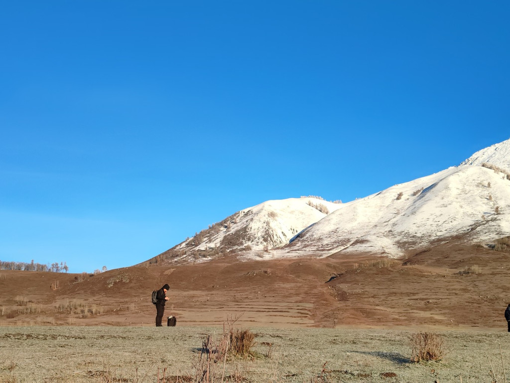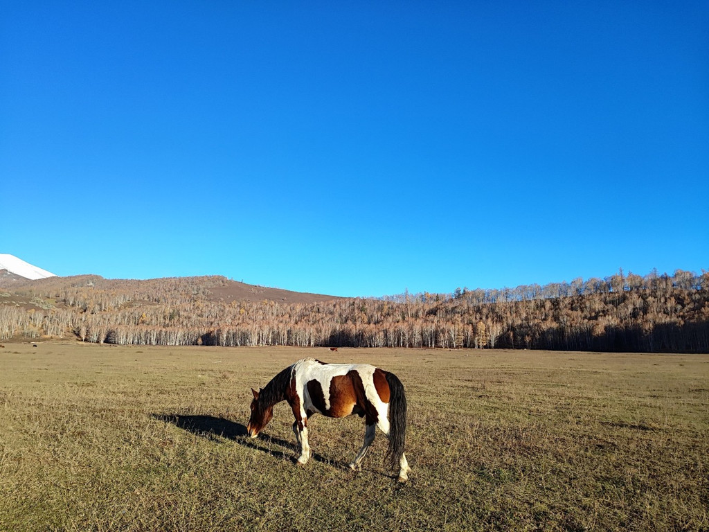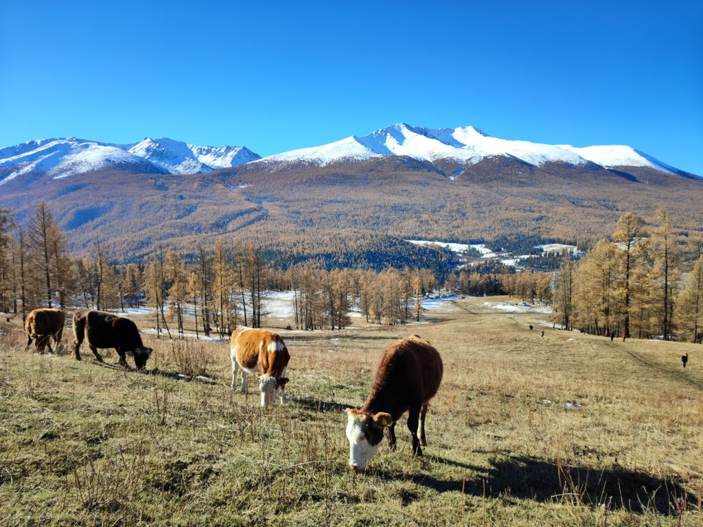 回到民宿,整理行李等车。坐在民宿老板后院,看远处的雪山,惬意。远处山坡有三头不同颜色的牛在吃草,于是大伙一起过去,才发觉这也是一大片草场,后来才知叫洪 巴斯 大草原,很大的一片还有些许绿意,远处是一大片茂密的白桦树林,时不时有牛马从身旁经过,悠闲地吃草。