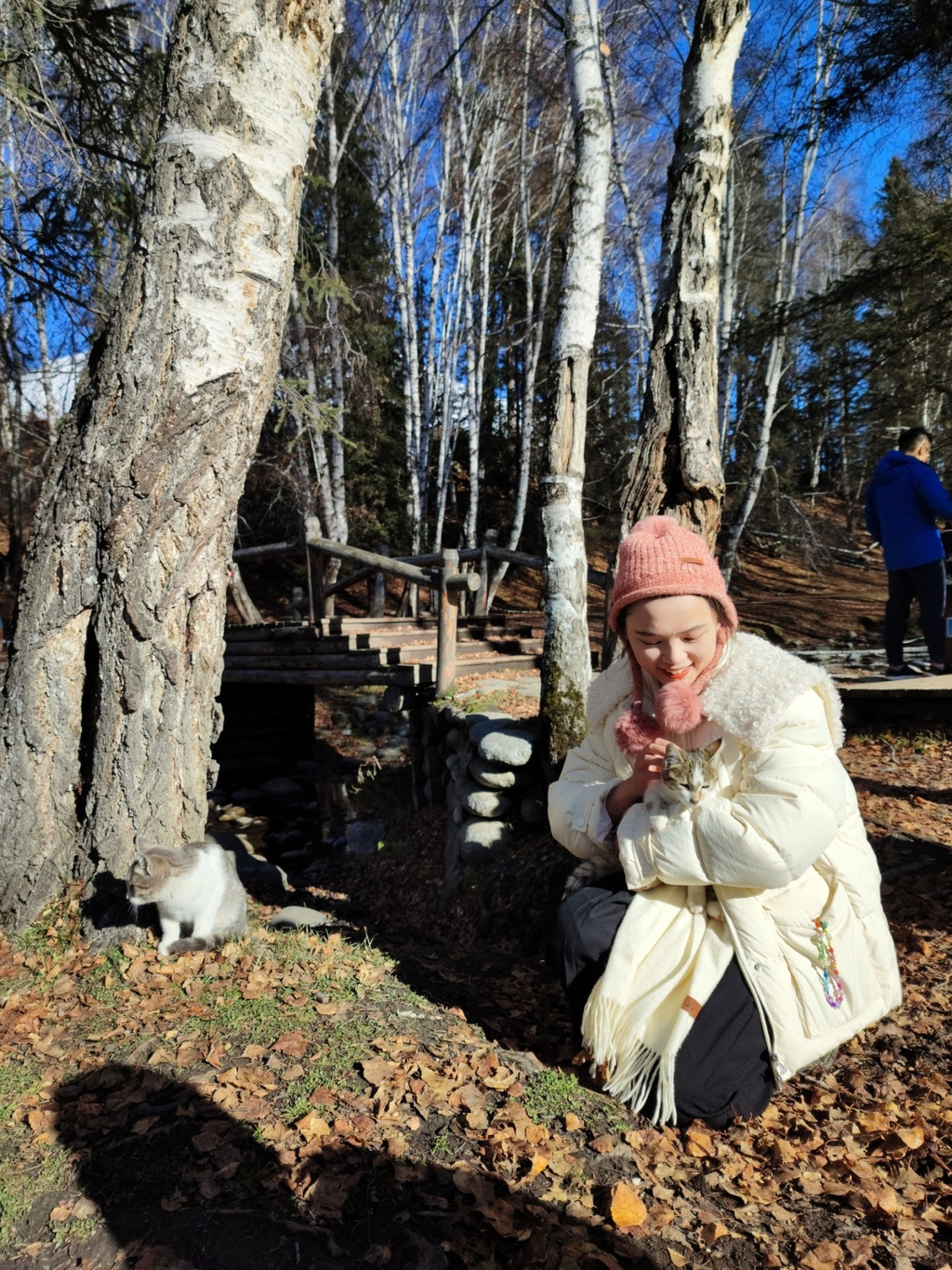 旁边是小桥流水,还有一大片白桦林,偶遇小猫,爱不释手。