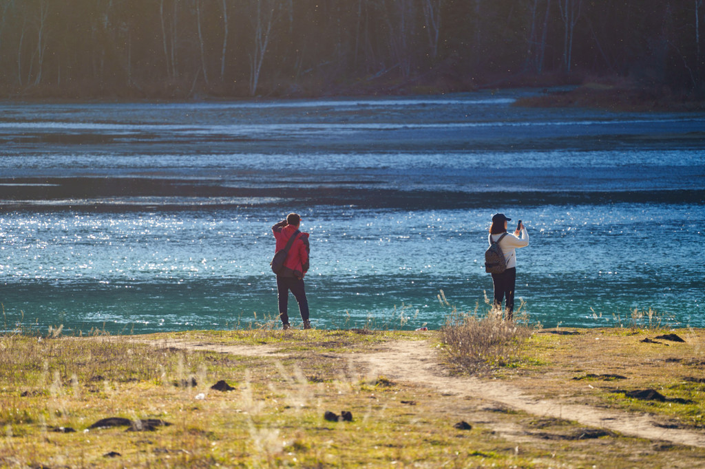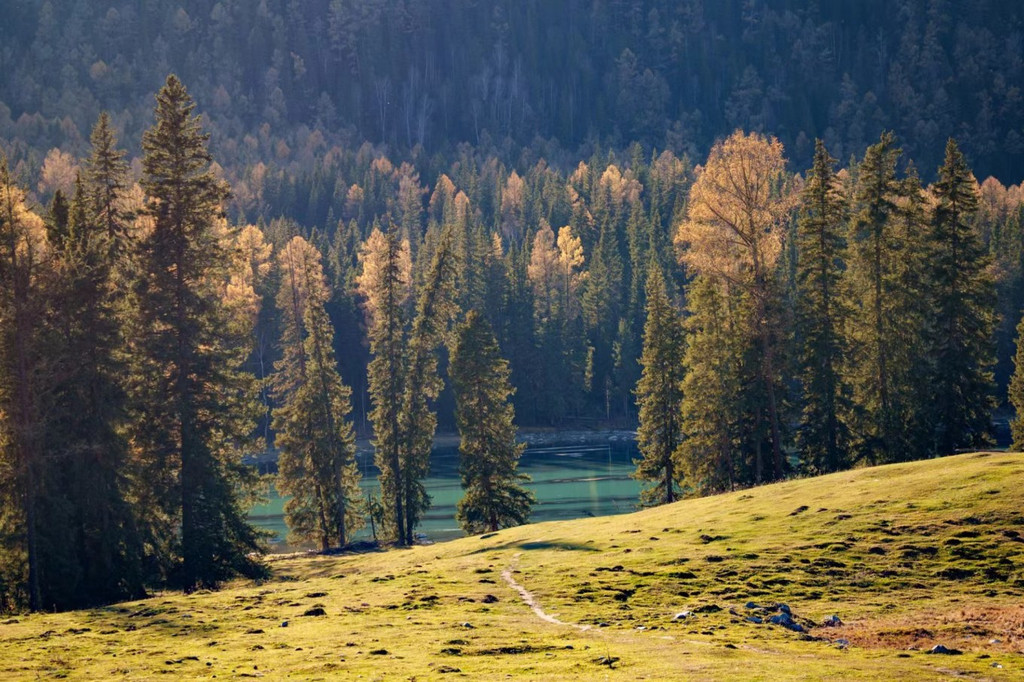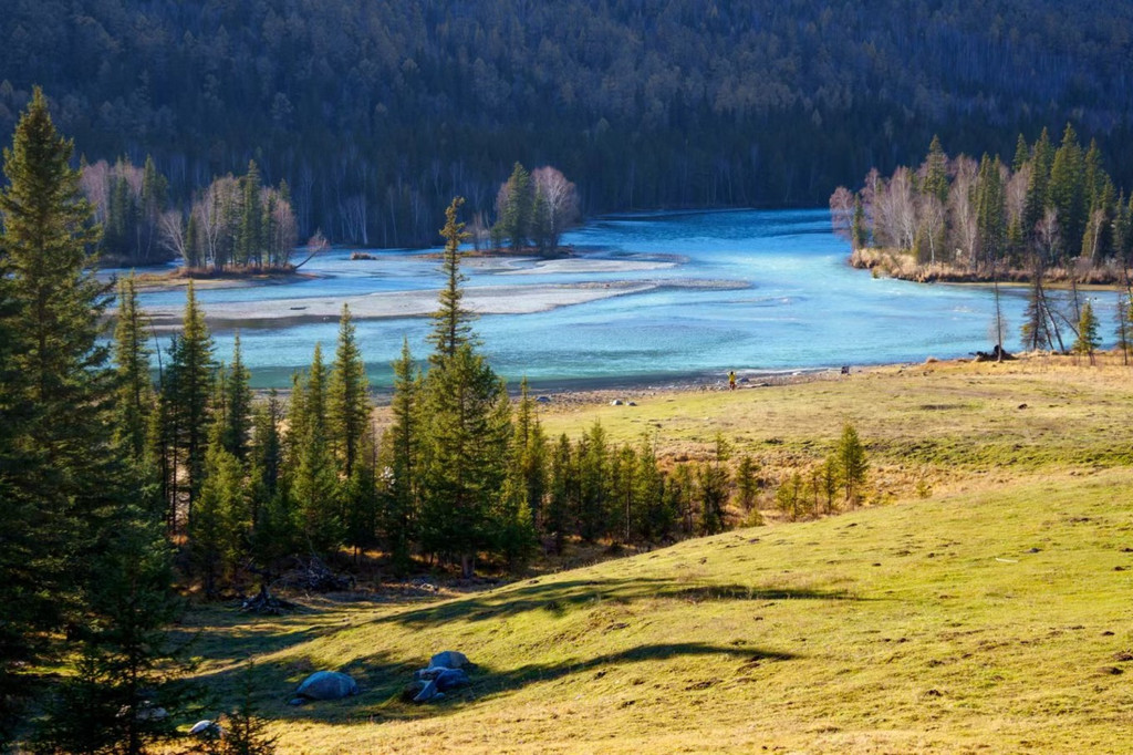 湖泊河流很清澈,纯净的绿色!草原是连绵成片宽广无边的,森林是连同山脉绵延到远方一眼望不到边的,而且这里的树木,常绿松柏或者落叶松,都非常高大,人站在树教下仰望,显得非常渺小。