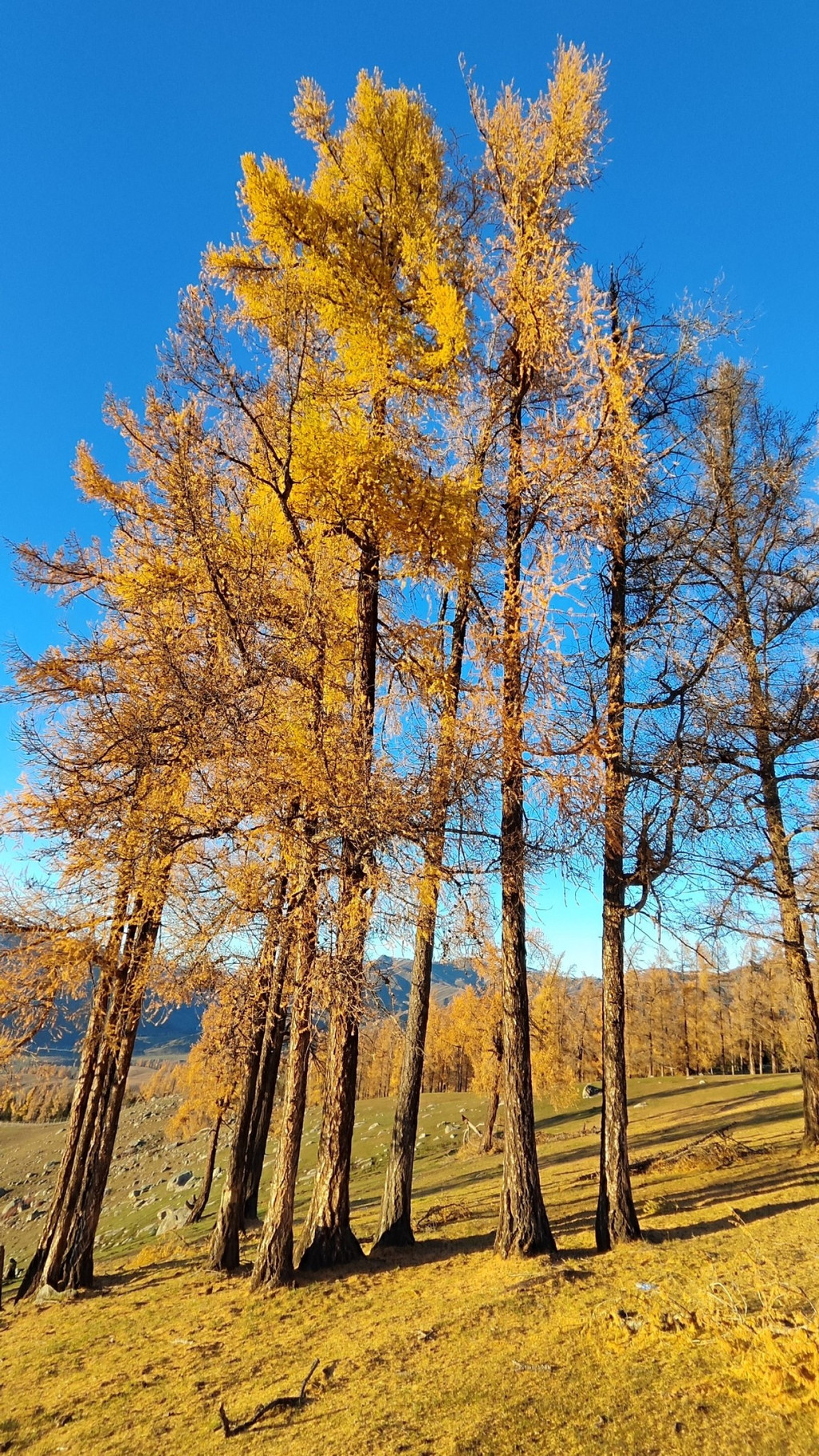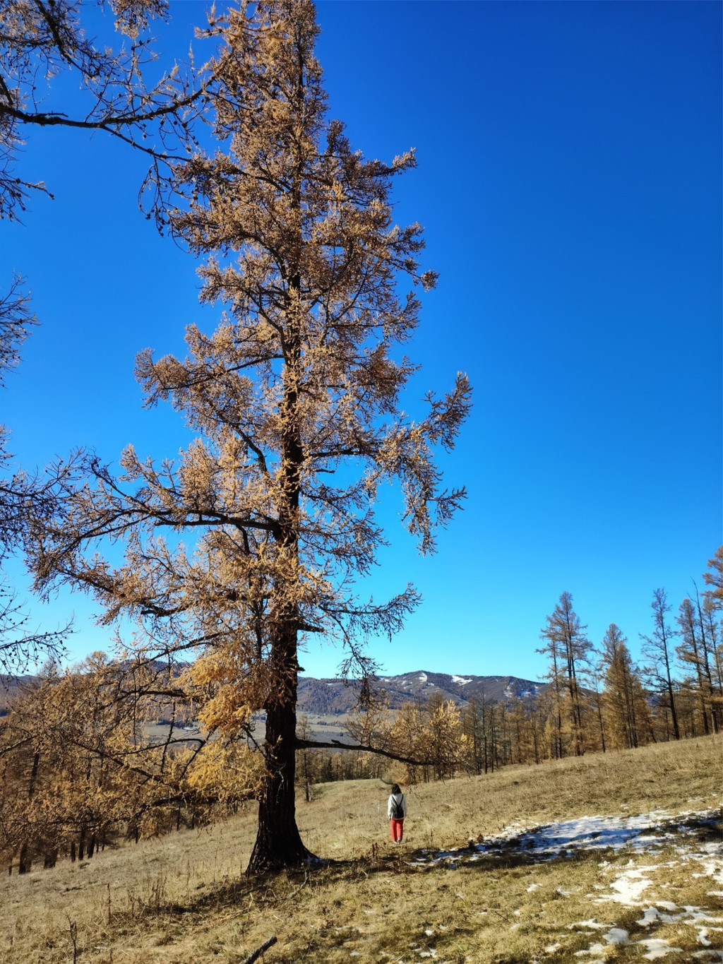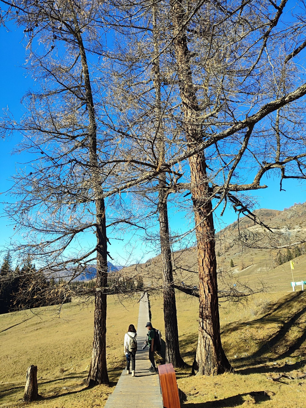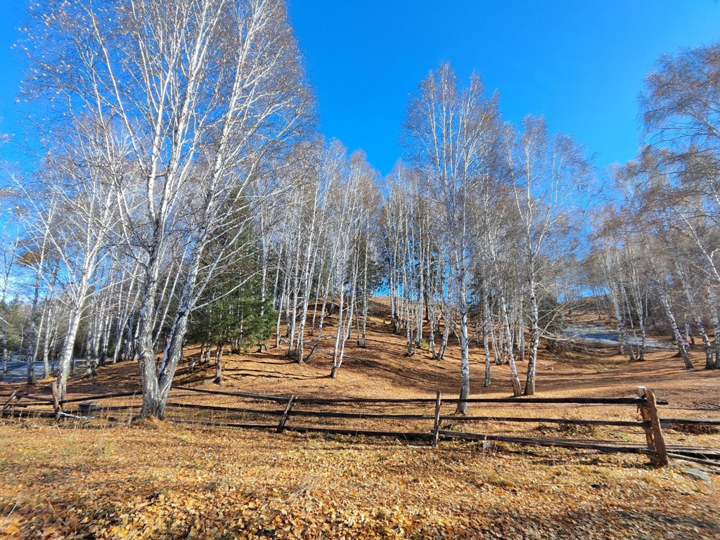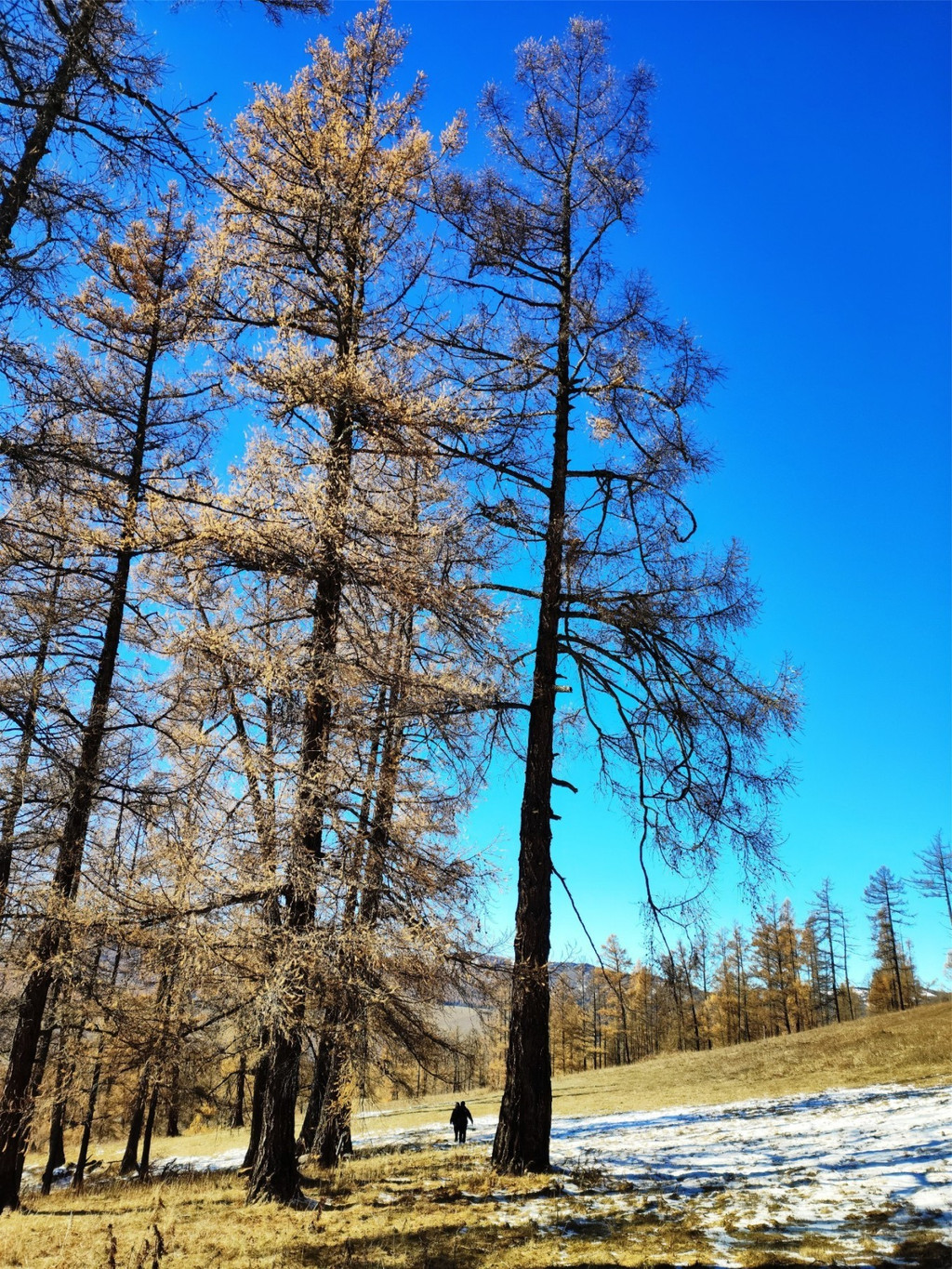 行程过半,天居然很神奇地明朗起来,特别蓝,雪也没了,树林逐渐露出原貌,内心不禁欣喜起来。尽管是秋末,大部分树木已光秃秃,但仍有少量还挂着金灿灿的树叶!晚秋的 禾木 ,我们来了!