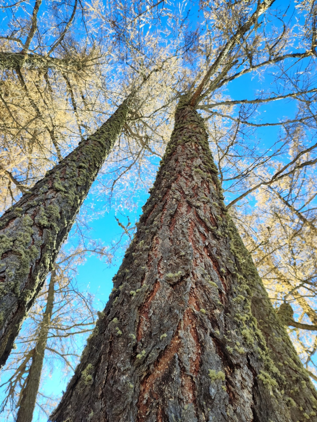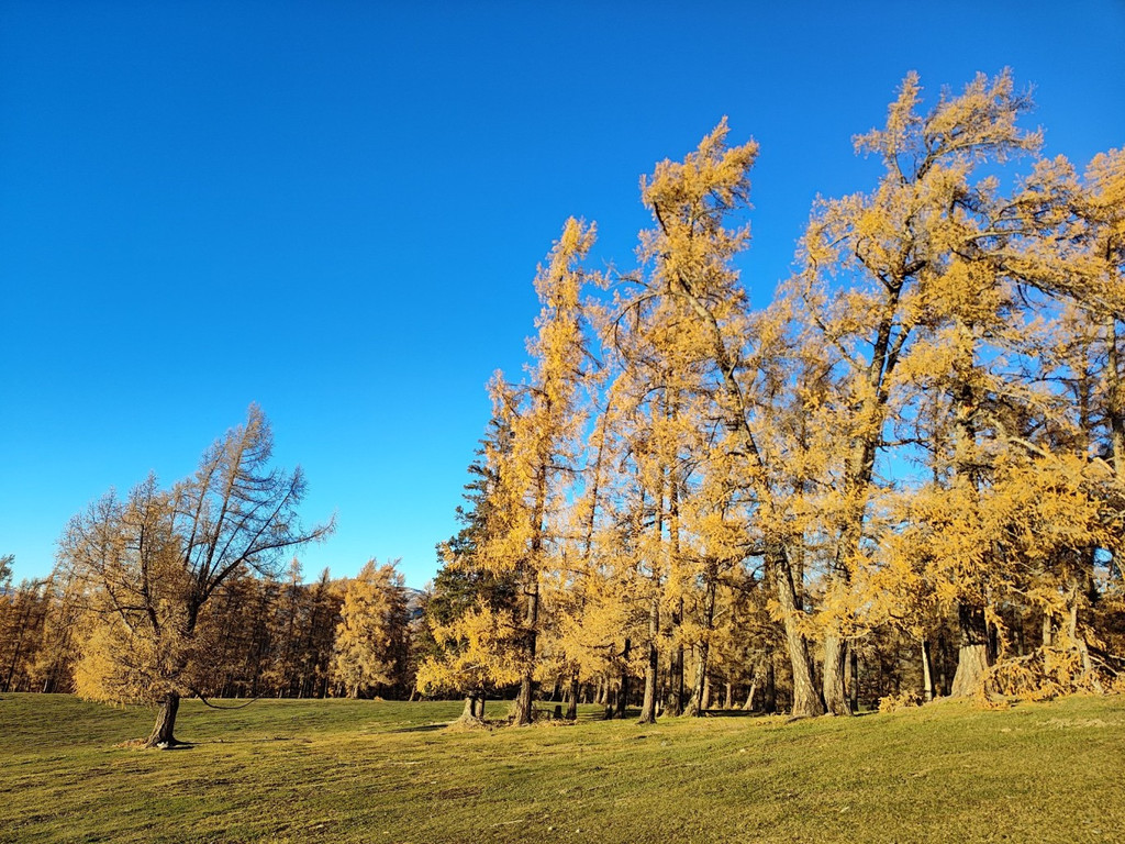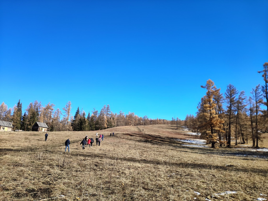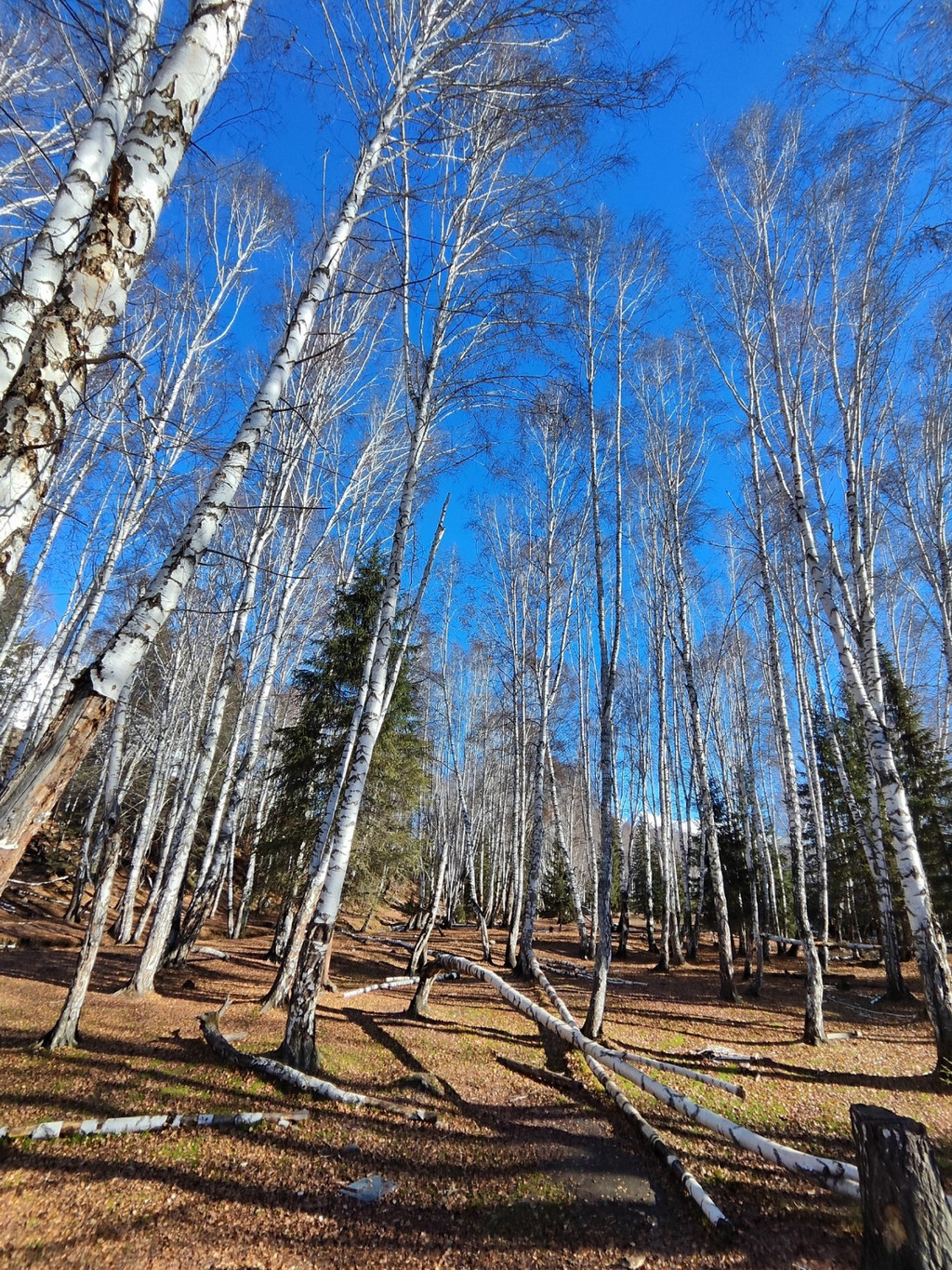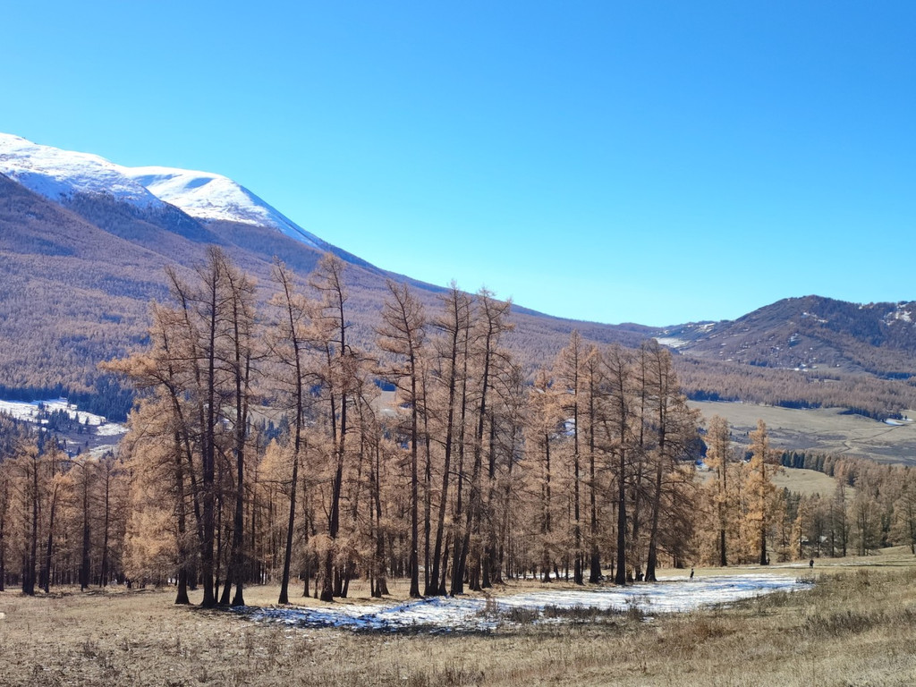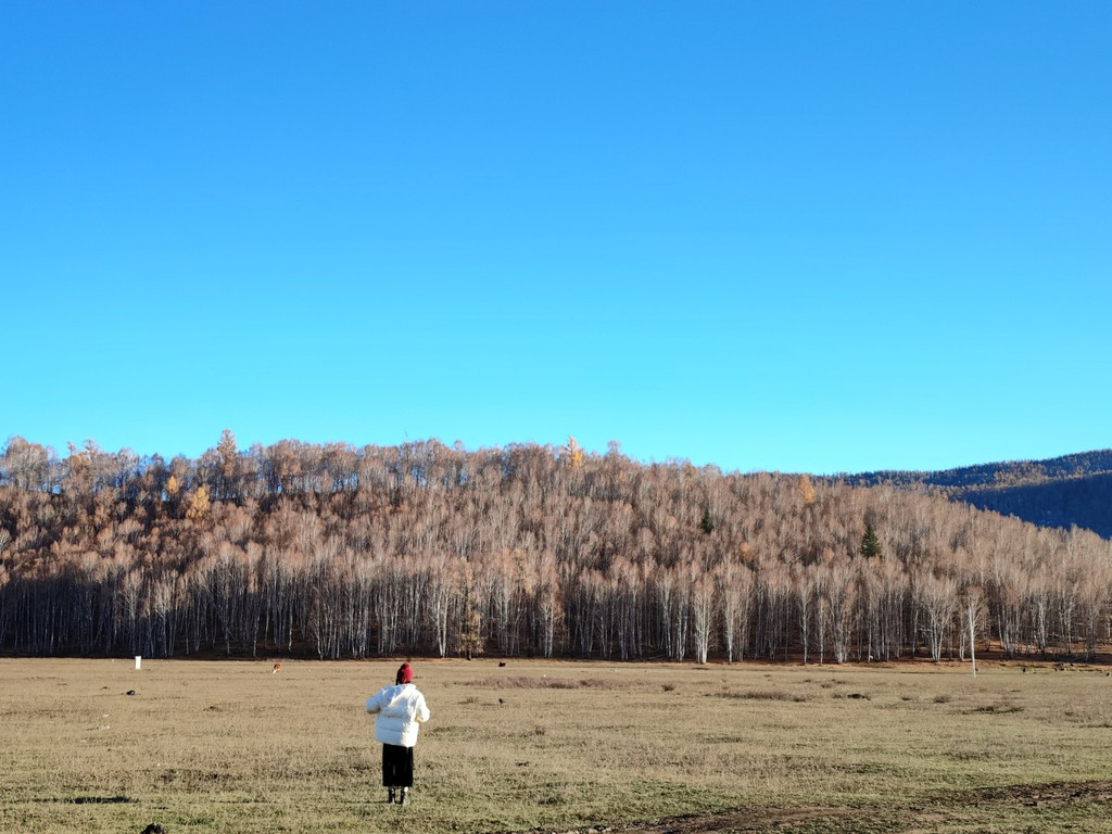 行程过半,天居然很神奇地明朗起来,特别蓝,雪也没了,树林逐渐露出原貌,内心不禁欣喜起来。尽管是秋末,大部分树木已光秃秃,但仍有少量还挂着金灿灿的树叶!晚秋的 禾木 ,我们来了!