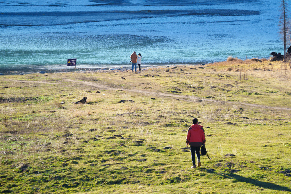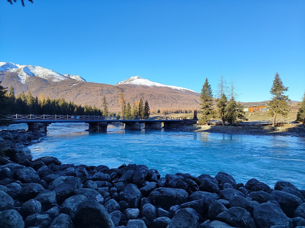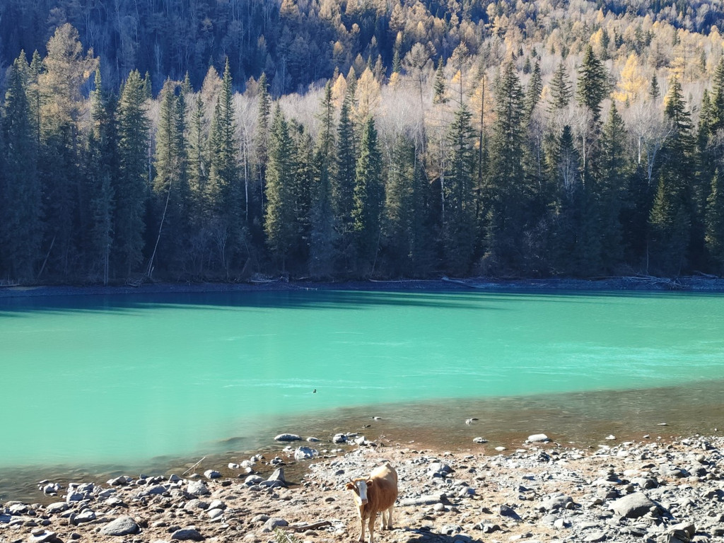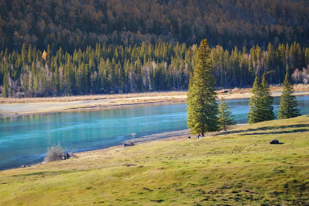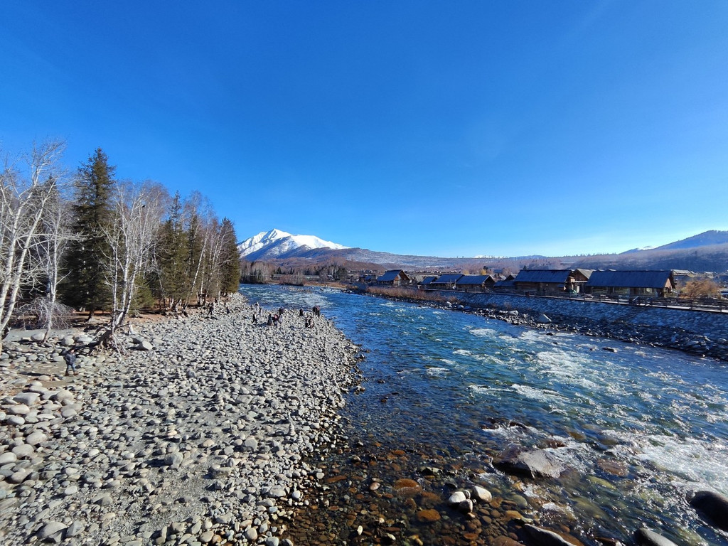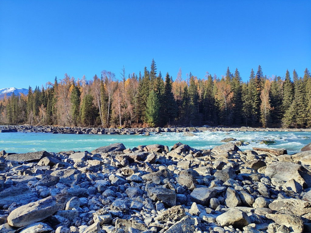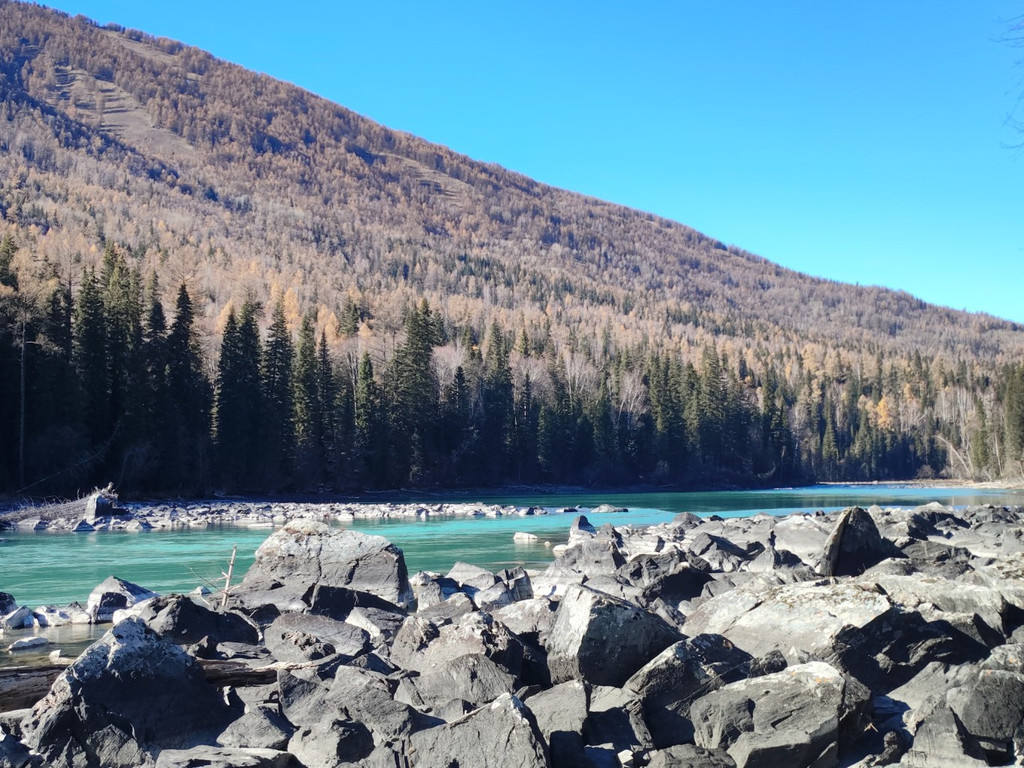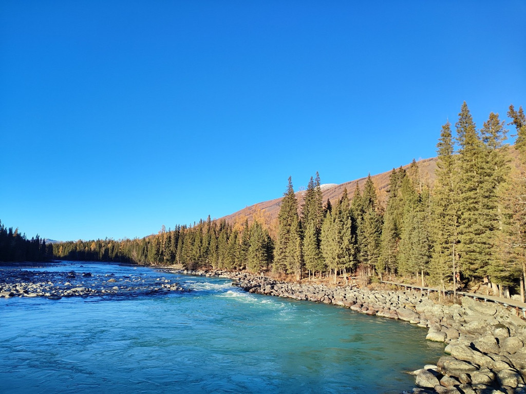 步行去河岸边,静静欣赏下这片好山好水。逛完神仙湾,路上拦车回 喀纳斯 老村。